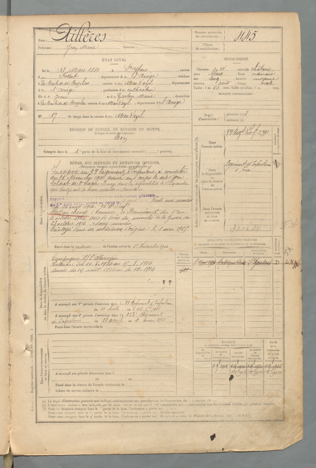 | Aillères | Jean Marie | FOIX | 129 W 2 | 1900 | Saint-Ybars | Bastide-de-Besplas (La) | 445 |