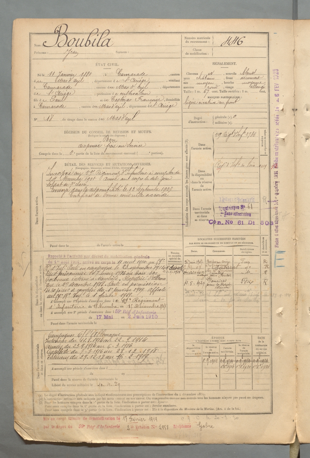 | Boubila | Jean | FOIX | 129 W 2 | 1900 | Camarade | Camarade | 446 |