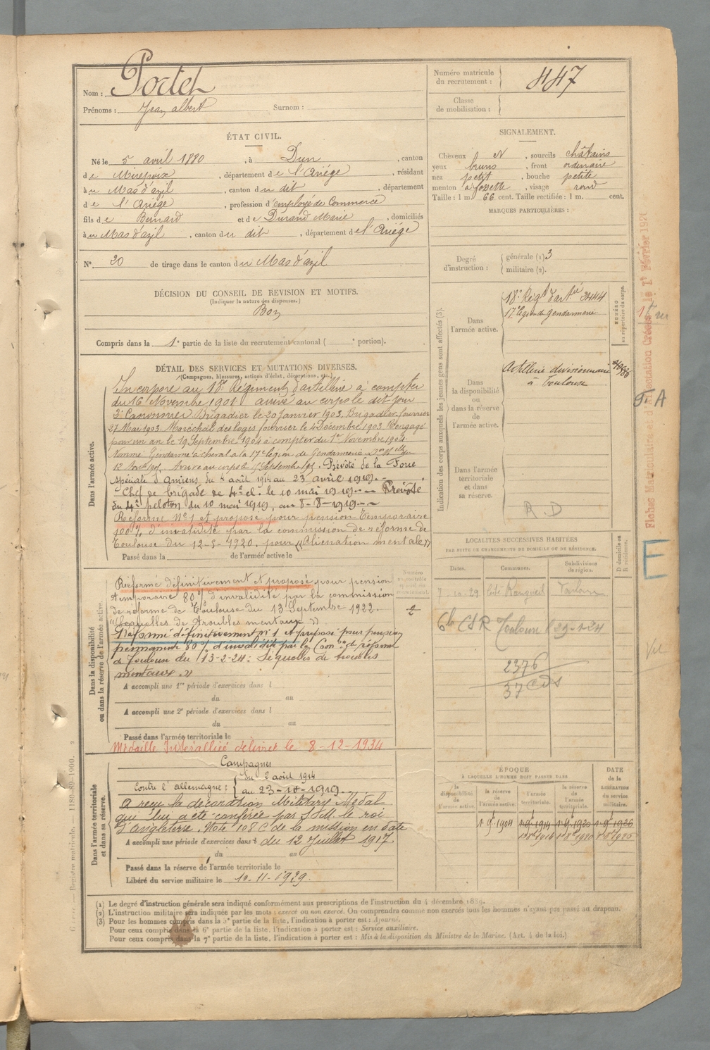 | Portet | Jean Albert | FOIX | 129 W 2 | 1900 | Dun | Mas-d'Azil (Le) | 447 |