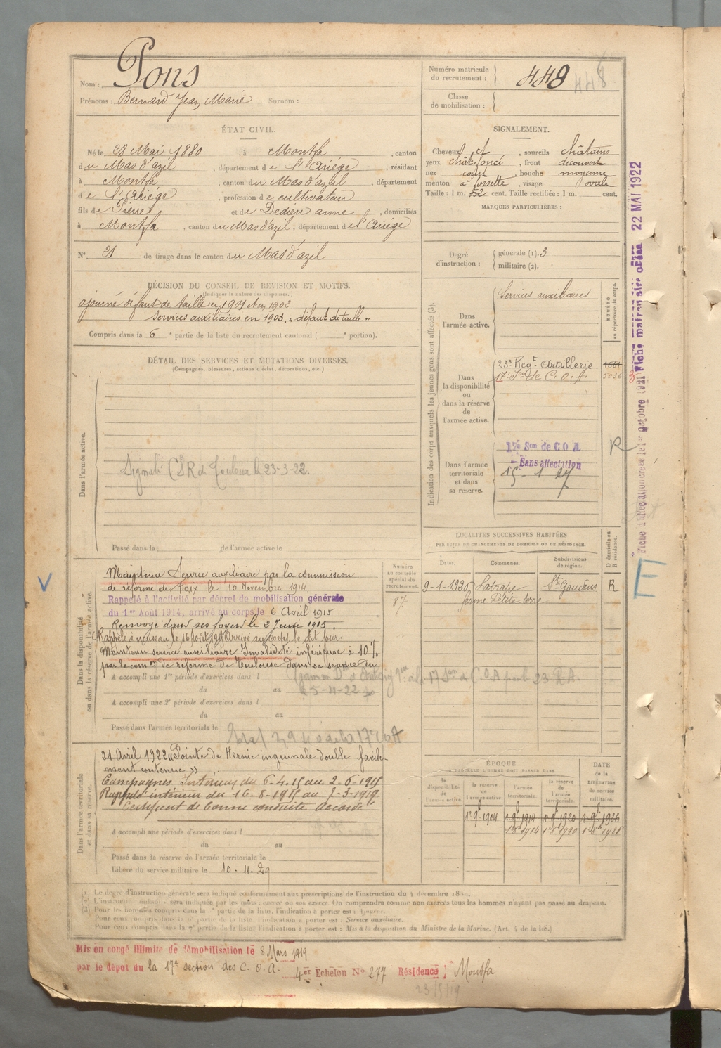 | Pons | Bernard Jean Marie | FOIX | 129 W 2 | 1900 | Montfa | Montfa | 448 |