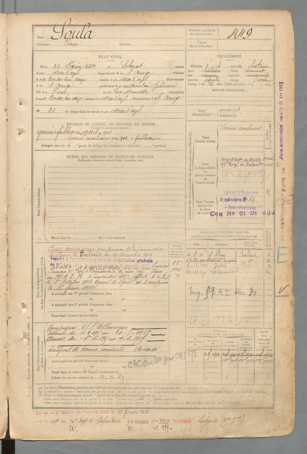 | Soula | Pierre | FOIX | 129 W 2 | 1900 | Sabarat | Bordes-sur-Arize (Les) | 449 |