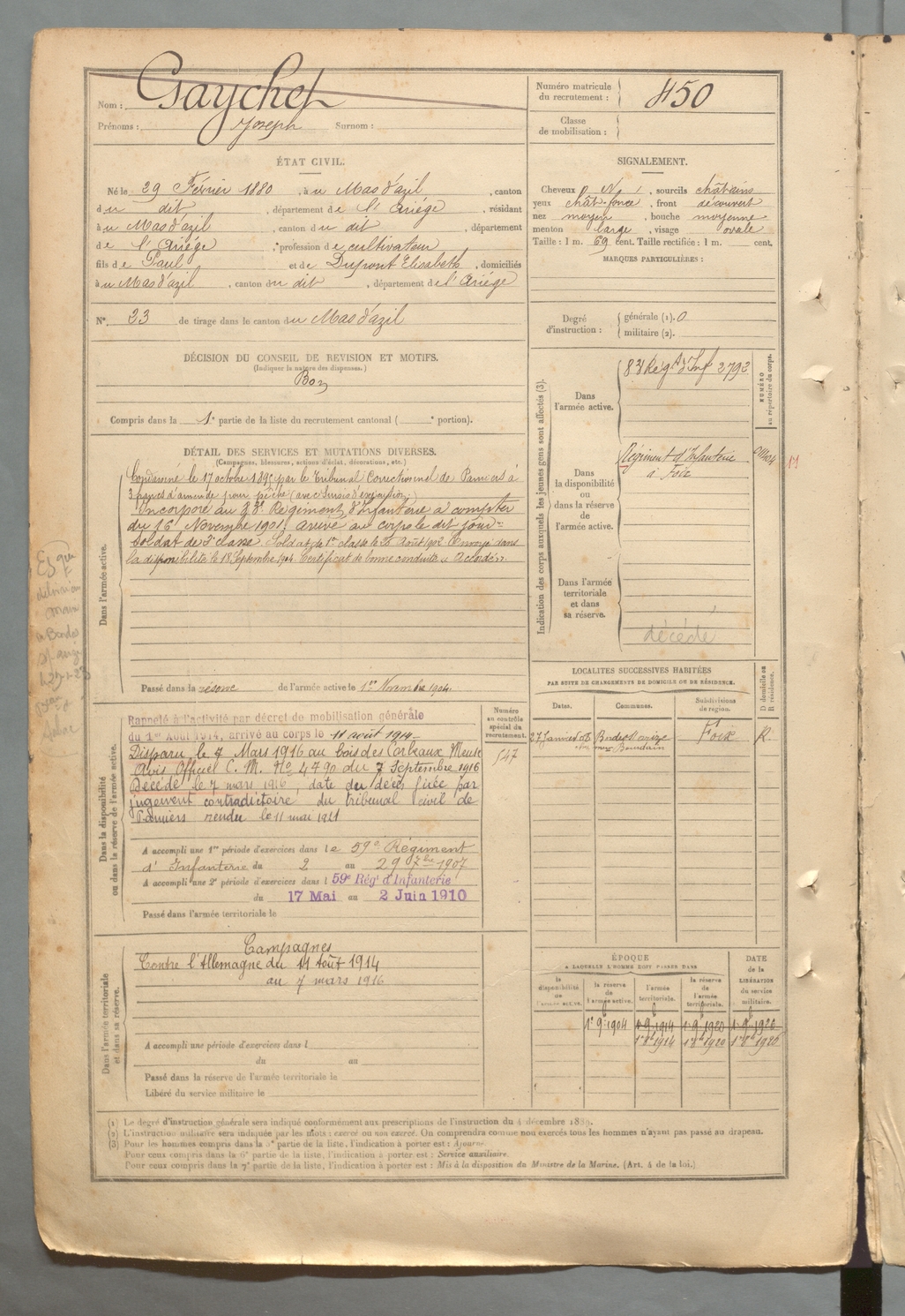 | Gaychet | Joseph | FOIX | 129 W 2 | 1900 | Mas-d'Azil (Le) | Mas-d'Azil (Le) | 450 |