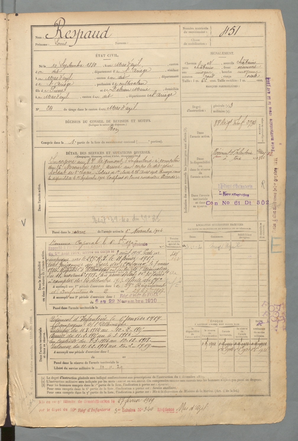| Respaud | Louis | FOIX | 129 W 2 | 1900 | Mas-d'Azil (Le) | Mas-d'Azil (Le) | 451 |