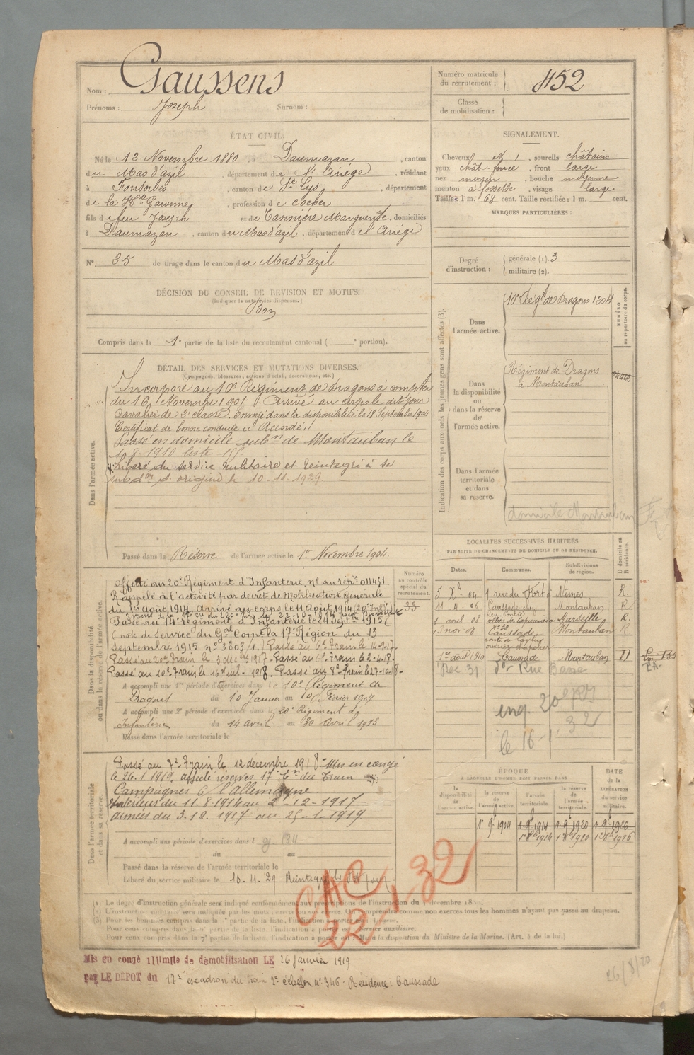 | Gaussens | Joseph | FOIX | 129 W 2 | 1900 | Daumazan | Fonsorbes | 452 |