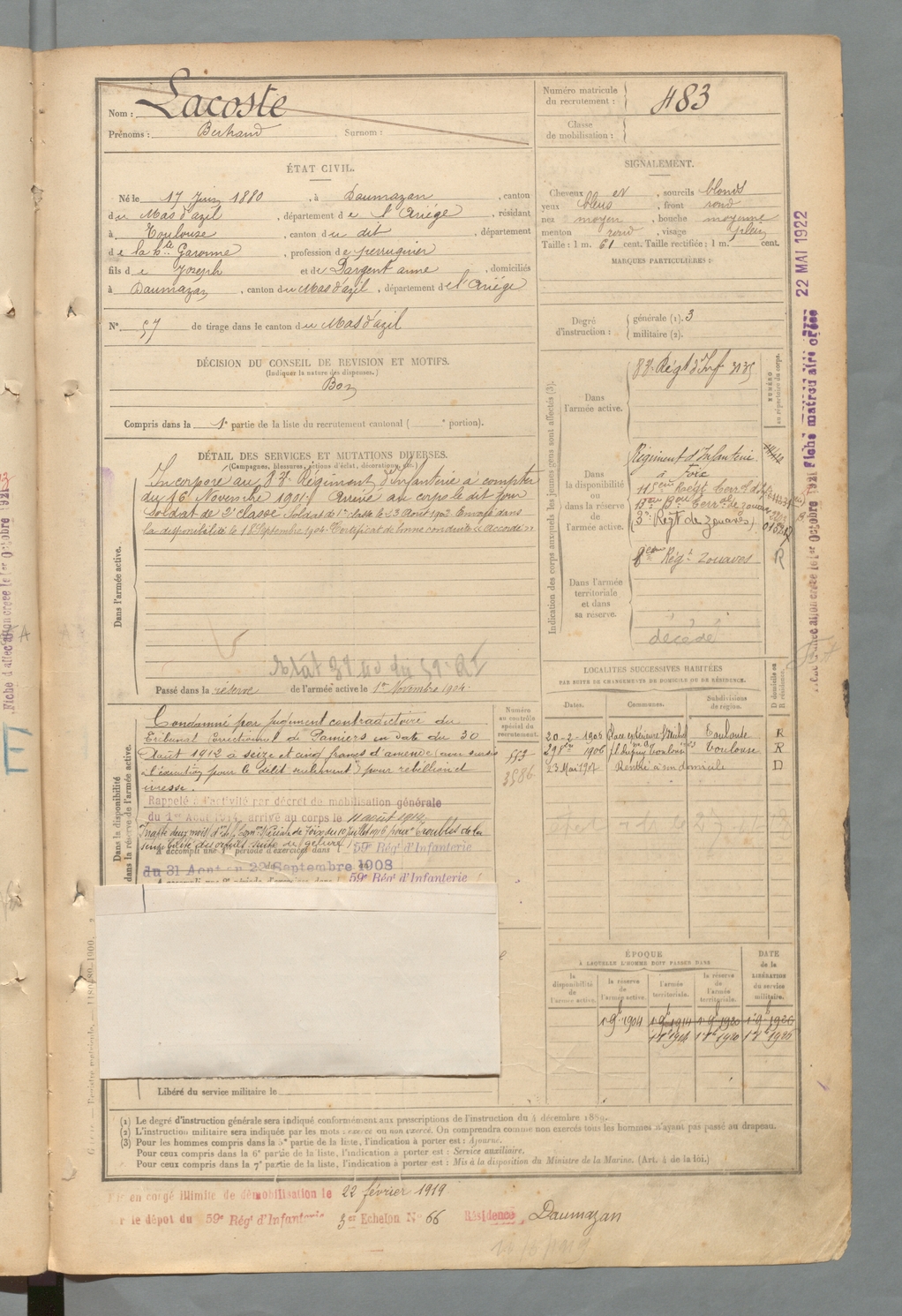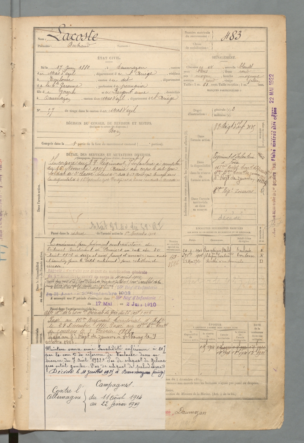 | Lacoste | Bertrand | FOIX | 129 W 2 | 1900 | Daumazan | Toulouse | 483 |