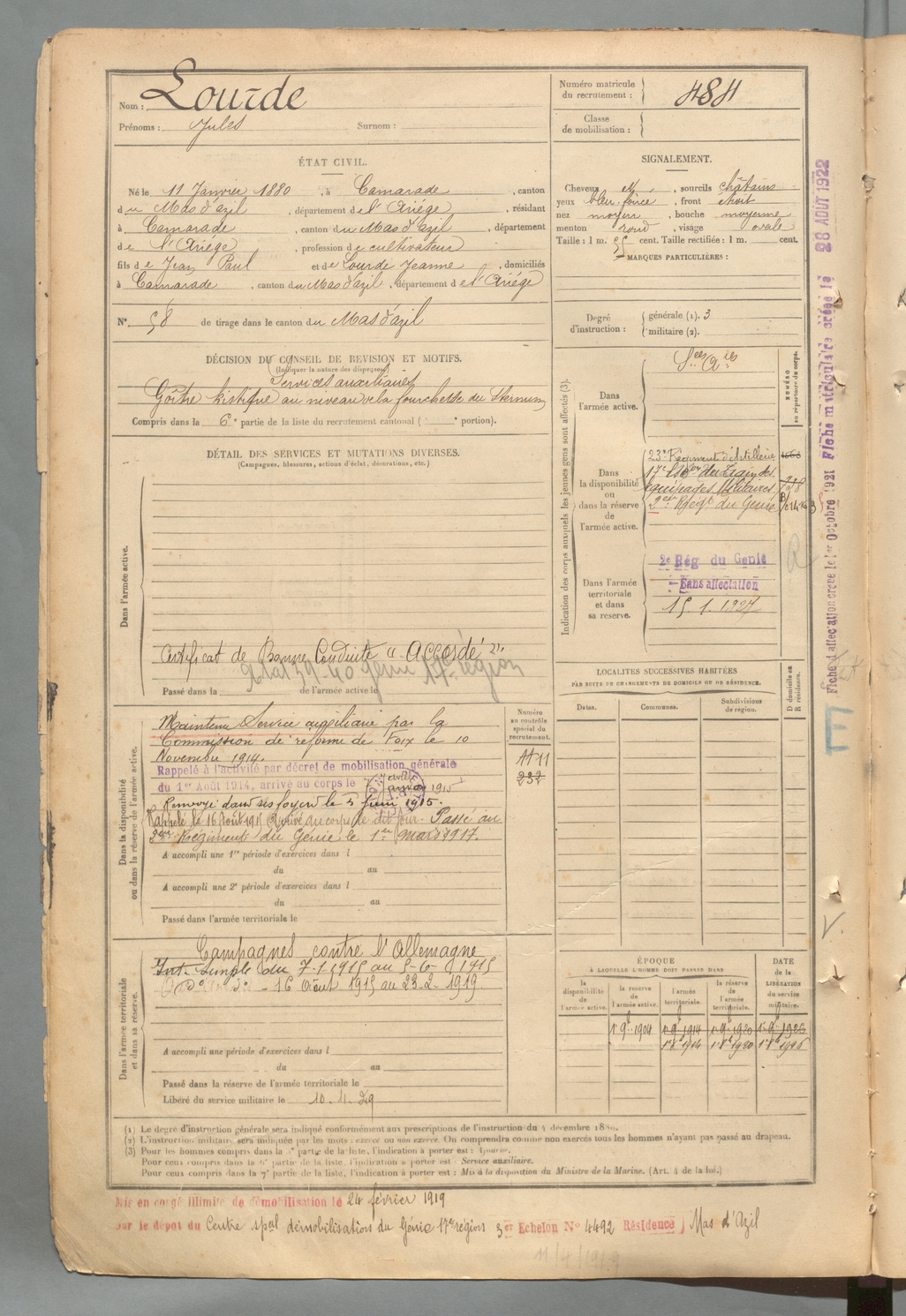| Lourde | Jules | FOIX | 129 W 2 | 1900 | Camarade | Camarade | 484 |