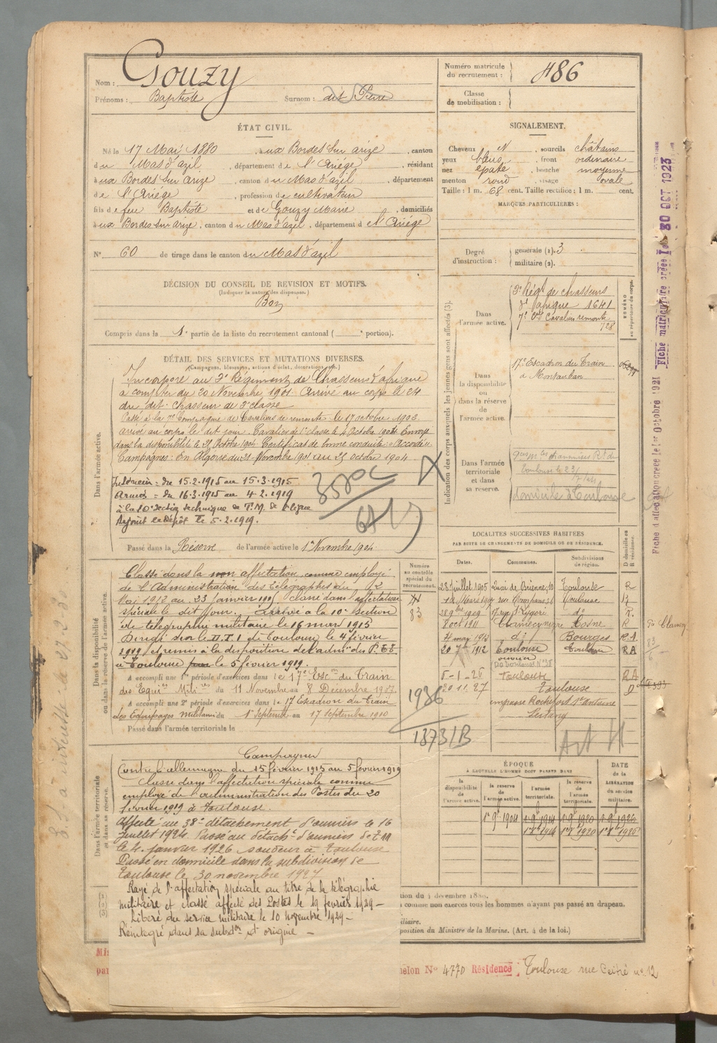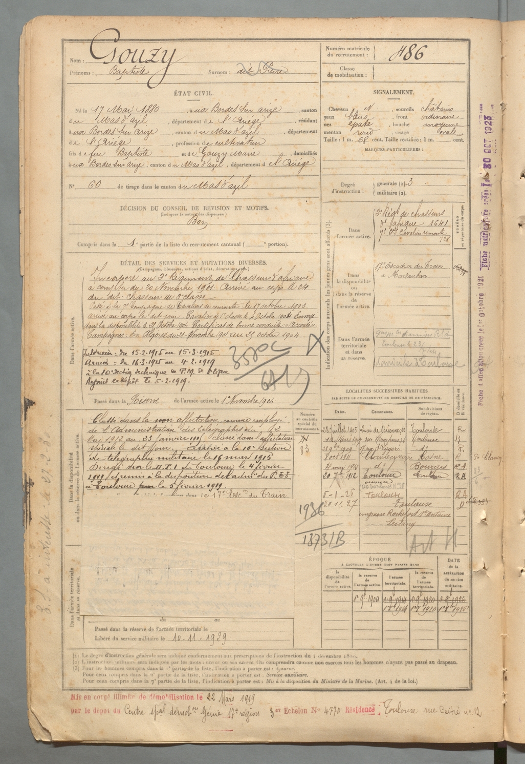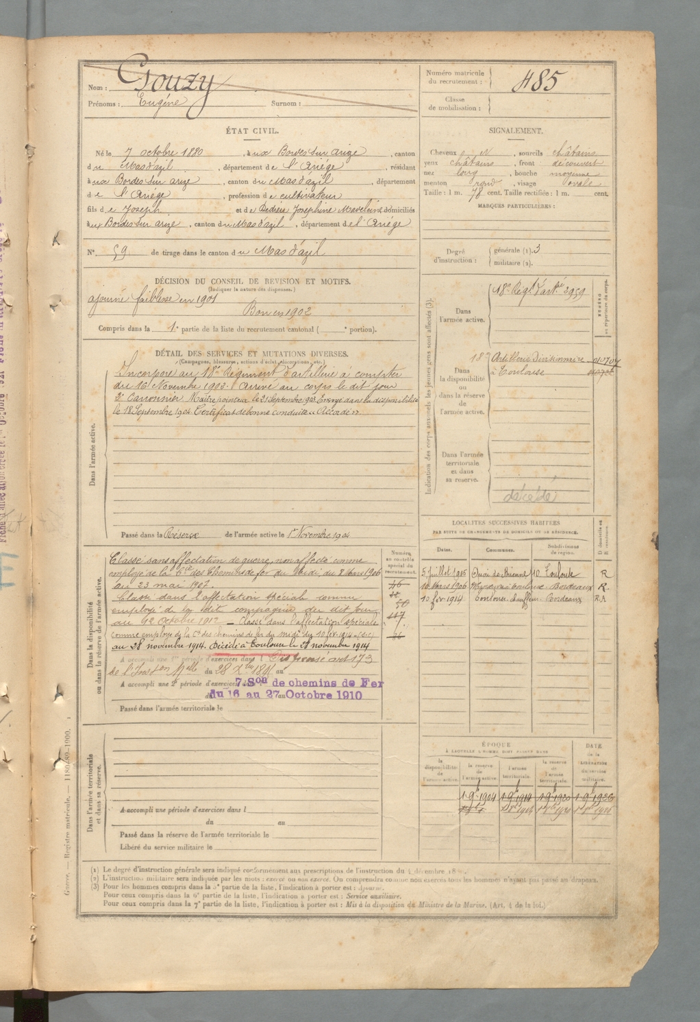 | Gouzy | Eugène | FOIX | 129 W 2 | 1900 | Bordes-sur-Arize (Les) | Bordes-sur-Arize (Les) | 485 |