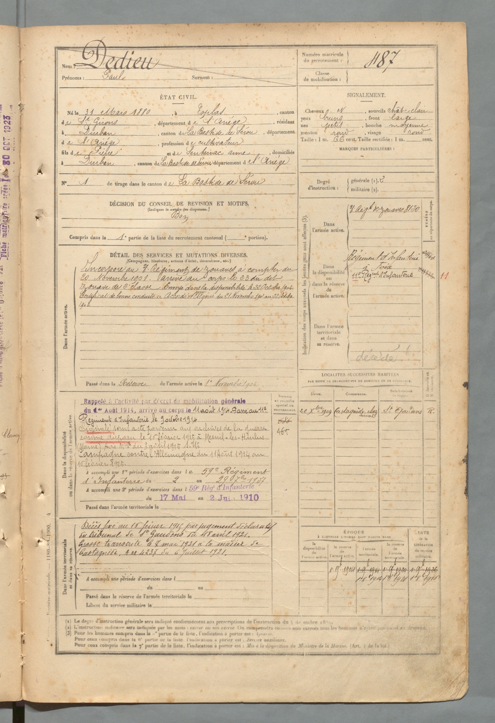 | Dedieu | Paul | FOIX | 129 W 2 | 1900 | Esplas-de-Sérou | Durban-sur-Arize | 487 |