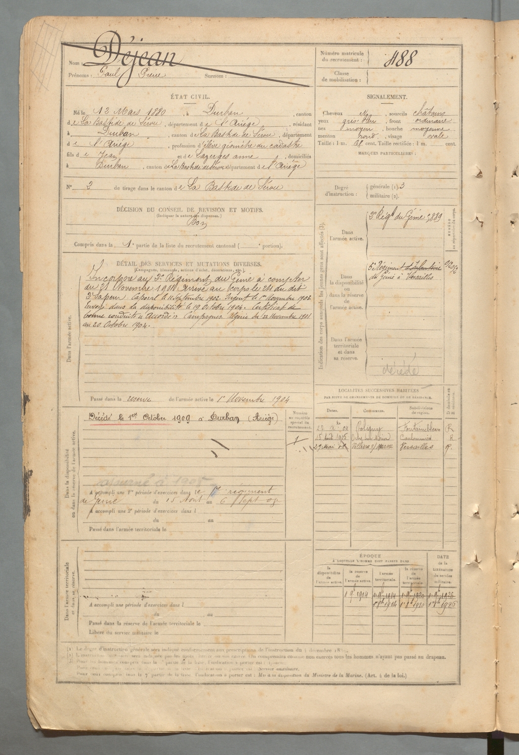 | Déjean | Paul Pierre | FOIX | 129 W 2 | 1900 | Durban-sur-Arize | Durban-sur-Arize | 488 |