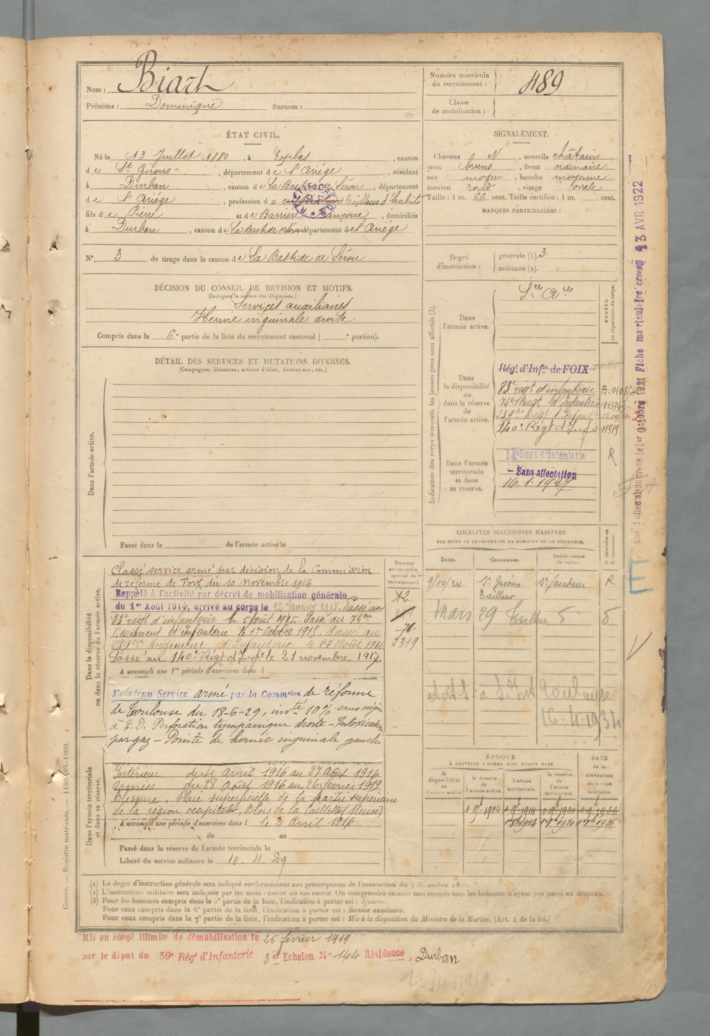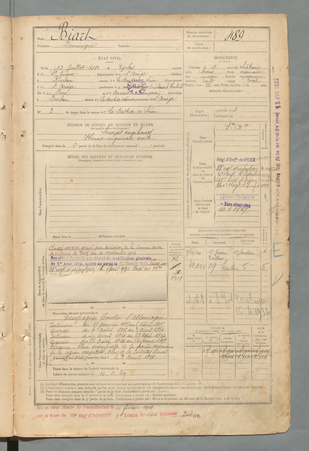 | Biart | Dominique | FOIX | 129 W 2 | 1900 | Esplas-de-Sérou | Durban-sur-Arize | 489 |