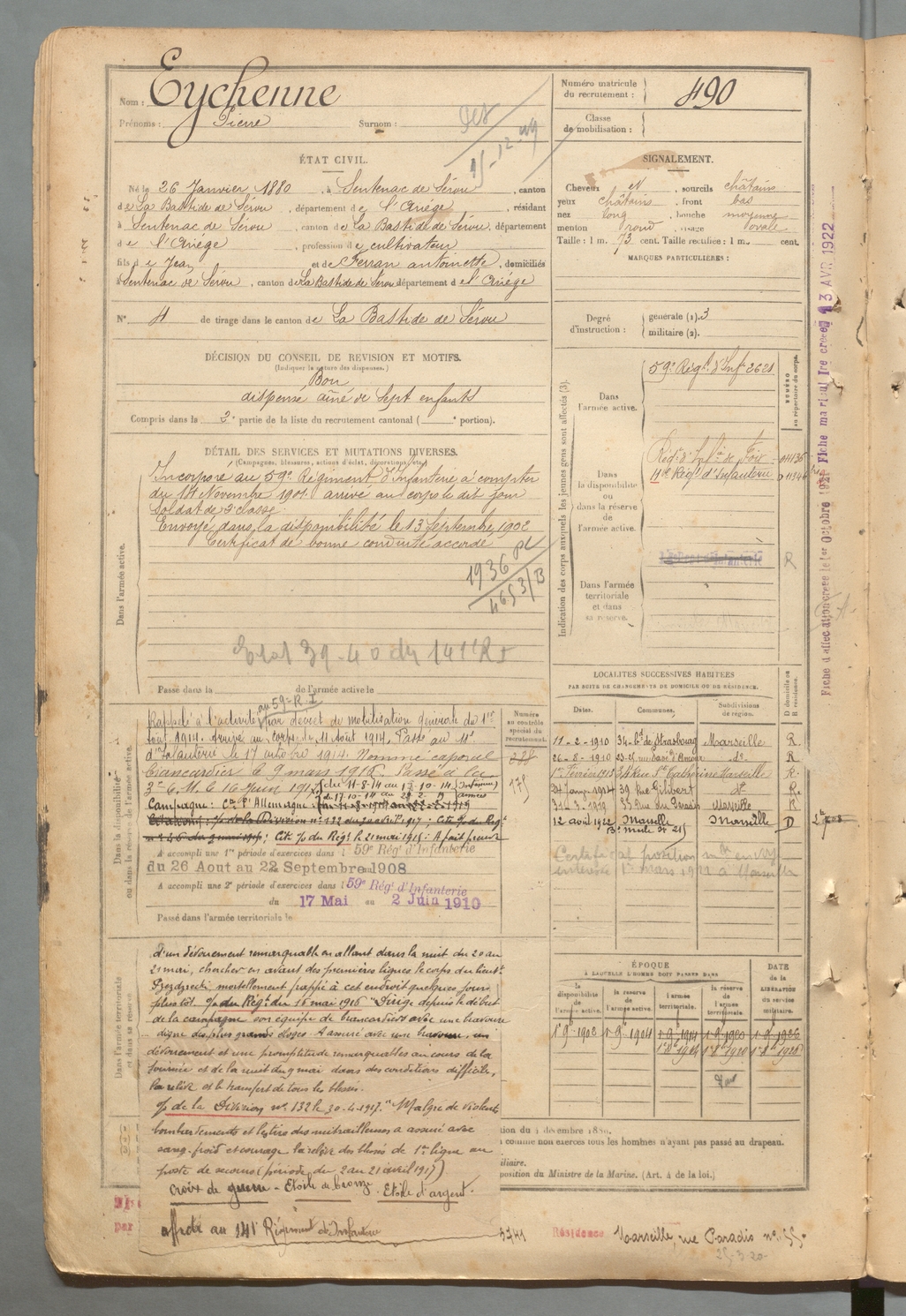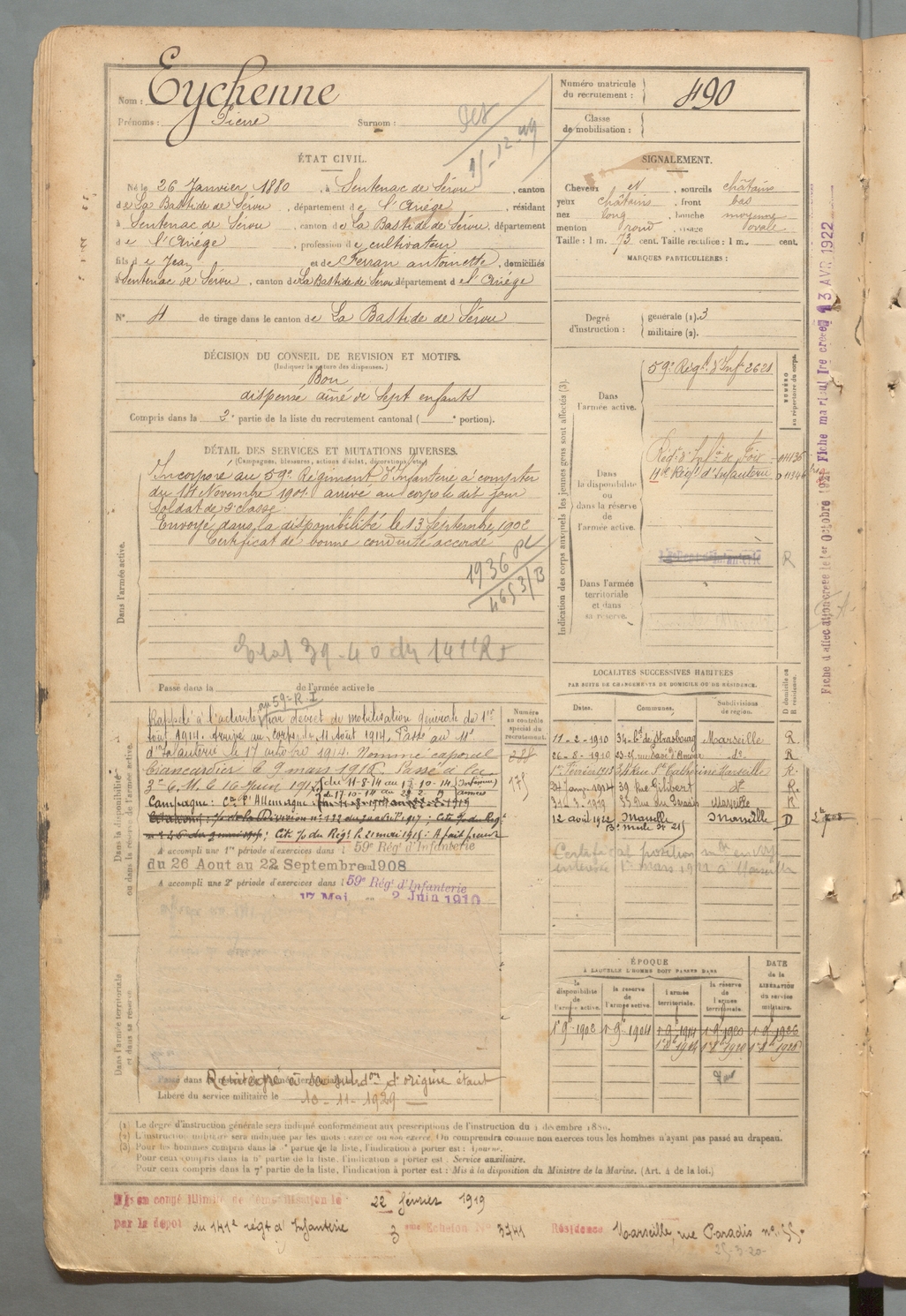 | Eychenne | Pierre | FOIX | 129 W 2 | 1900 | Sentenac-de-Sérou | Sentenac-de-Sérou | 490 |