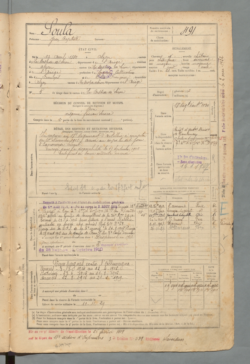 | Soula | Jean Baptiste | FOIX | 129 W 2 | 1900 | Alzen | Alzen | 491 |
