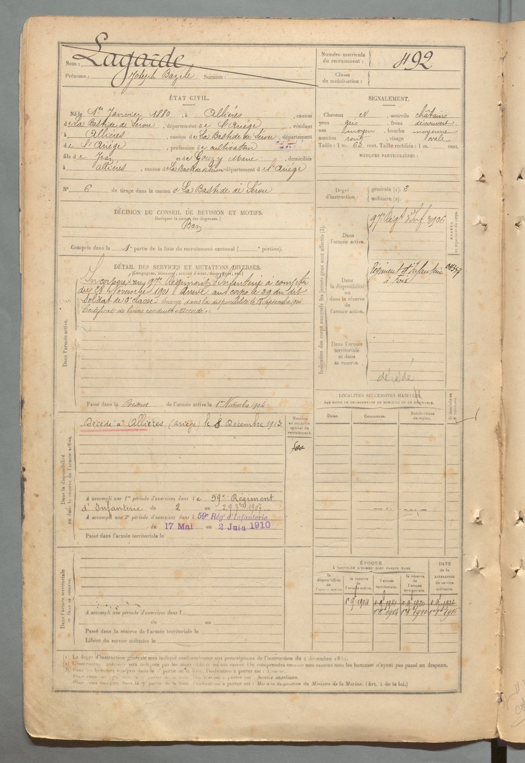 | Lagarde | Joseph Bazile | FOIX | 129 W 2 | 1900 | Allières | Allières | 492 |