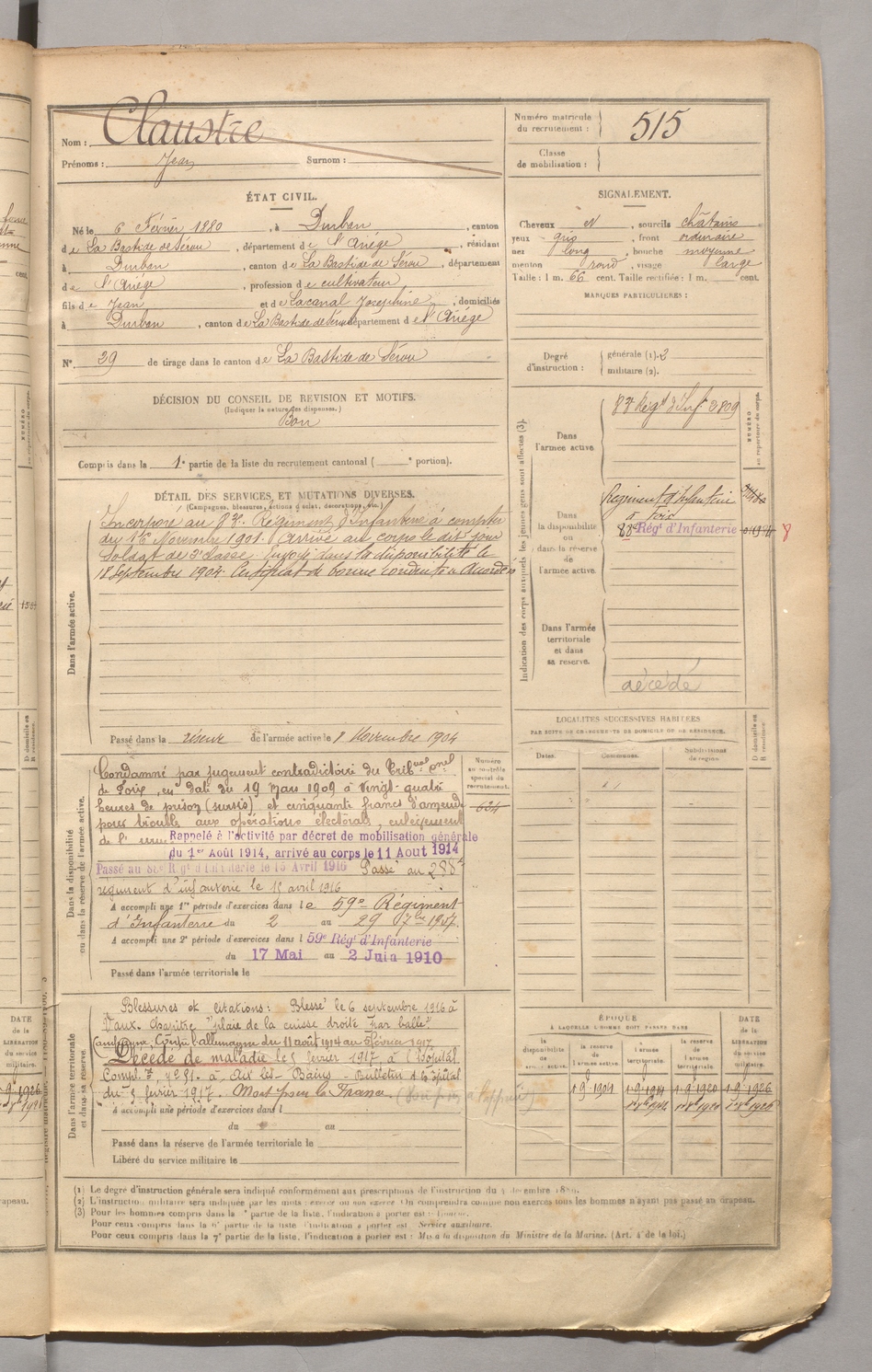 | Claustre | Jean | FOIX | 129 W 3 | 1900 | Durban-sur-Arize | Durban-sur-Arize | 515 |