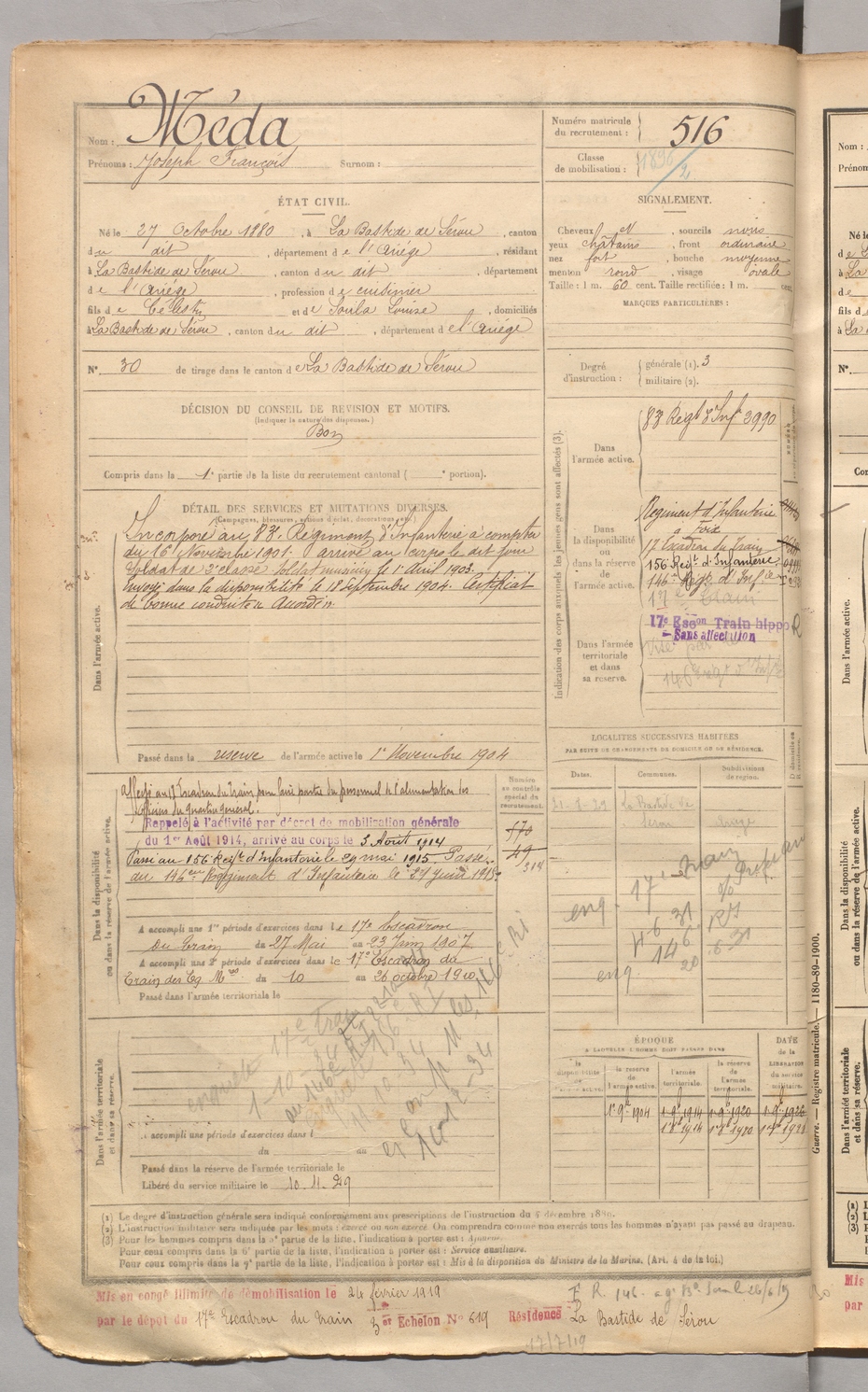 | Méda | Joseph François | FOIX | 129 W 3 | 1900 | Bastide-de-Sérou (La) | Bastide-de-Sérou (La) | 516 |