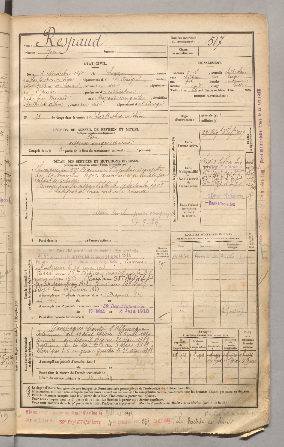 | Respaud | Jean | FOIX | 129 W 3 | 1900 | Suzan | Bastide-de-Sérou (La) | 517 |