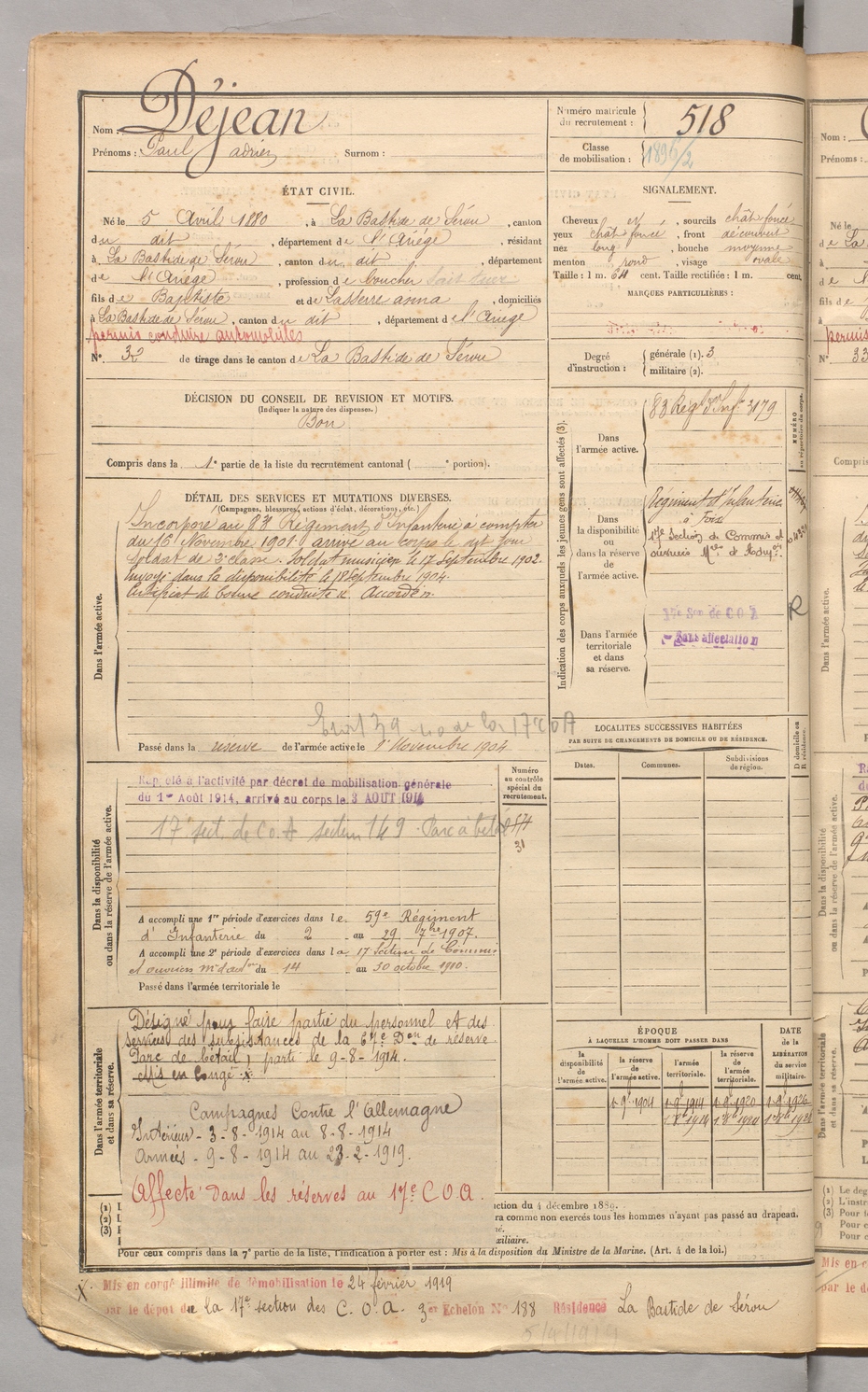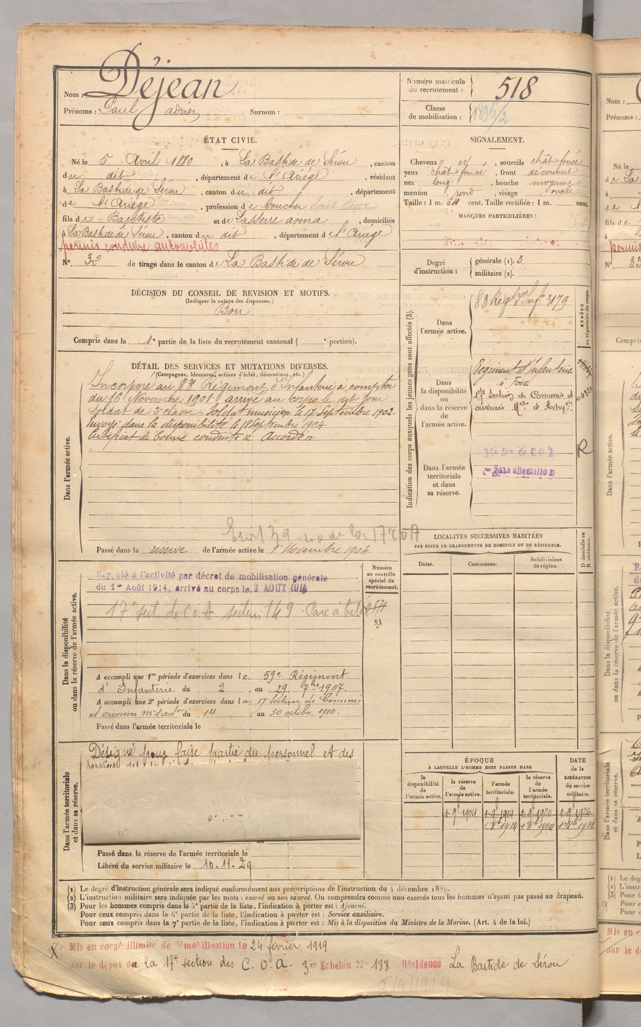 | Déjean | Paul Adrien | FOIX | 129 W 3 | 1900 | Bastide-de-Sérou (La) | Bastide-de-Sérou (La) | 518 |