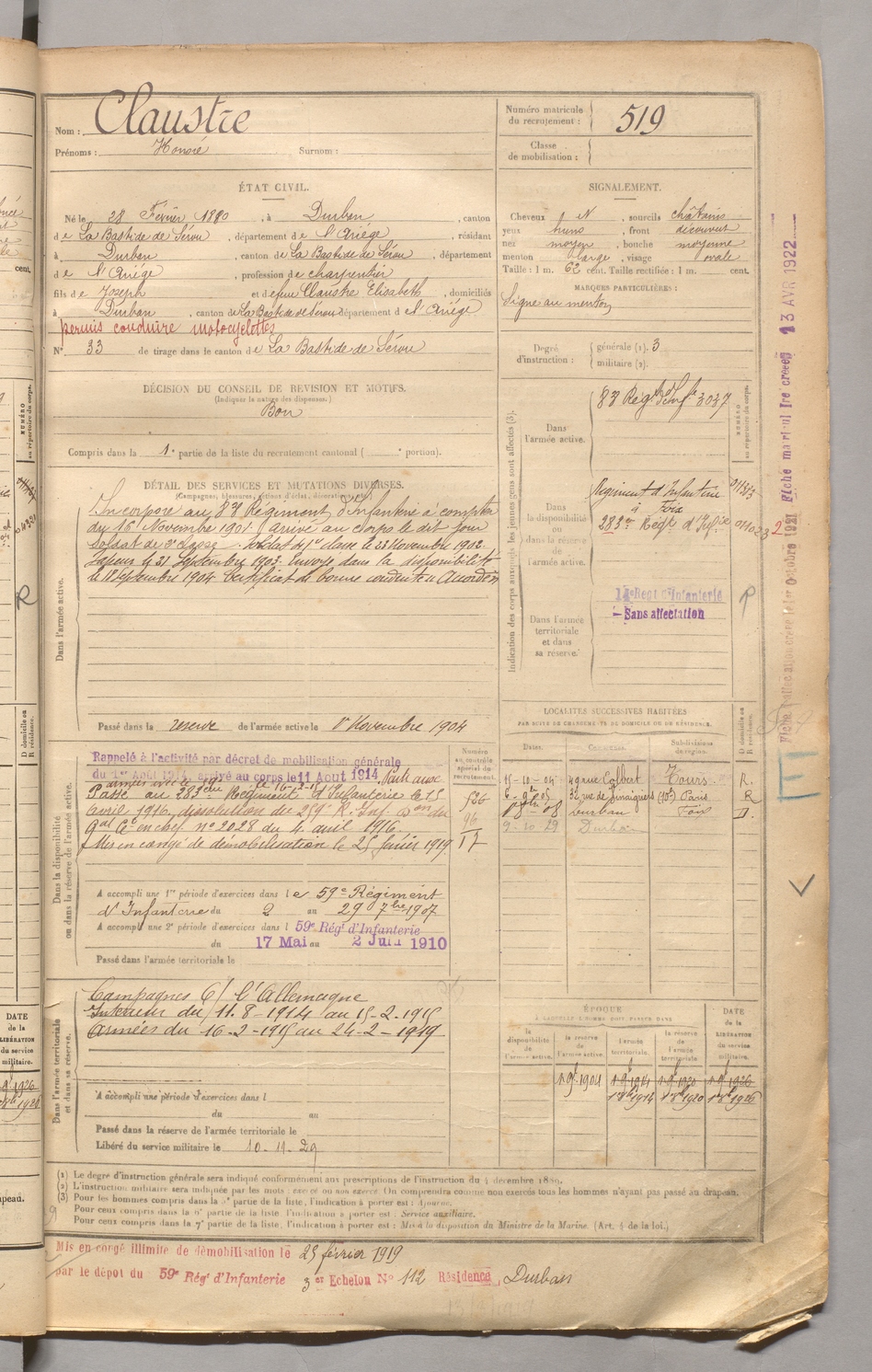 | Claustre | Honoré | FOIX | 129 W 3 | 1900 | Durban-sur-Arize | Durban-sur-Arize | 519 |