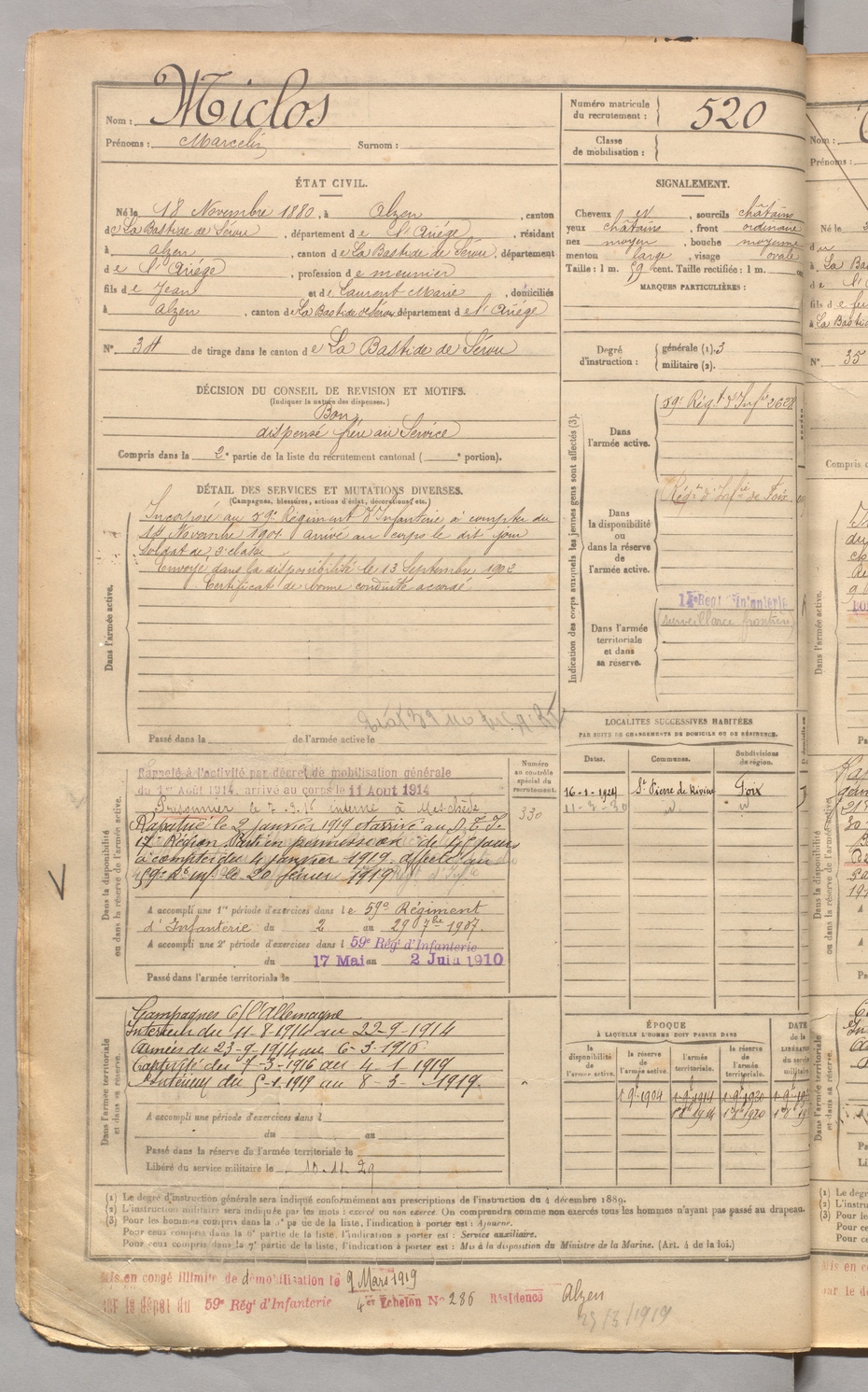 | Miclos | Marcelin | FOIX | 129 W 3 | 1900 | Alzen | Alzen | 520 |