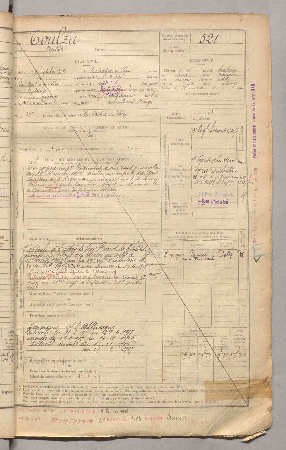 | Toulza | Baptiste | FOIX | 129 W 3 | 1900 | Bastide-de-Sérou (La) | Bastide-de-Sérou (La) | 521 |
