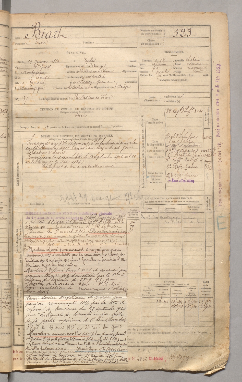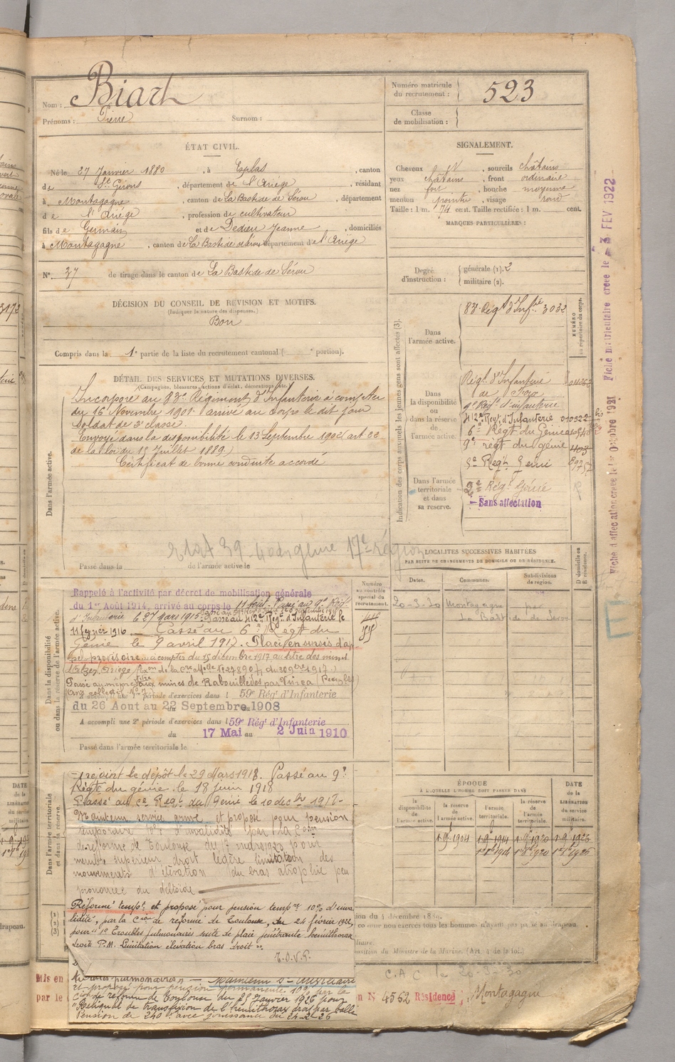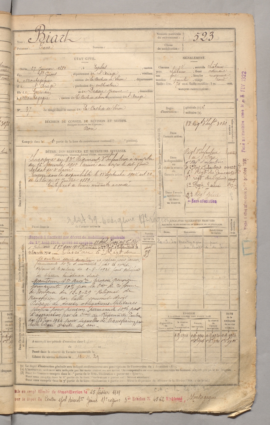 | Biart | Pierre | FOIX | 129 W 3 | 1900 | Esplas-de-Sérou | Montagagne | 523 |