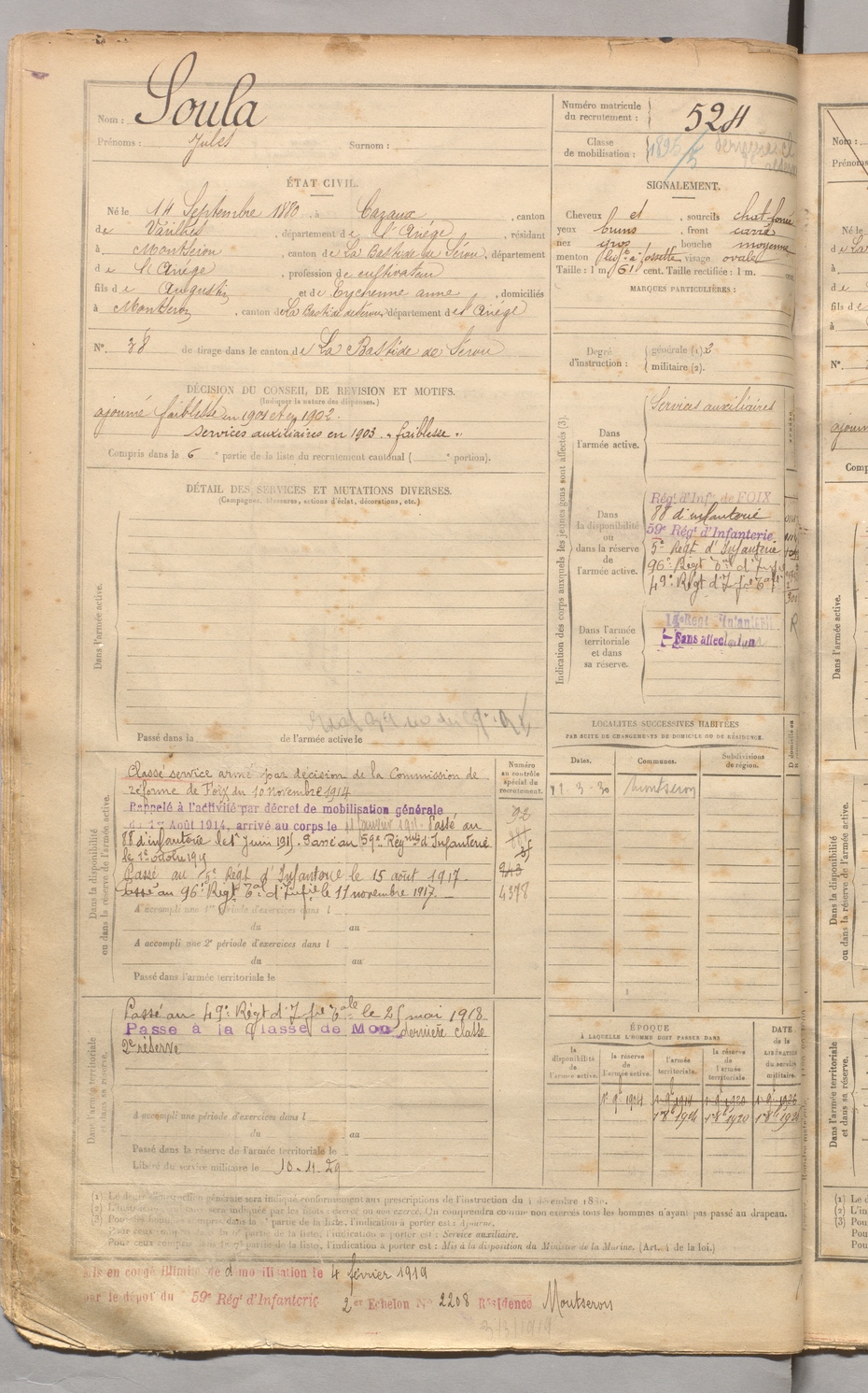 | Soula | Jules | FOIX | 129 W 3 | 1900 | Cazaux | Montseron | 524 |