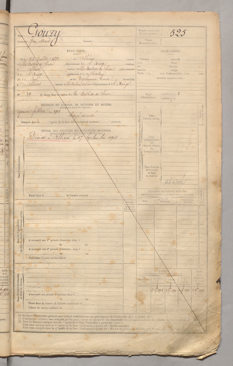 | Gouzy | Jean Marie | FOIX | 129 W 3 | 1900 | Allières | Allières | 525 |