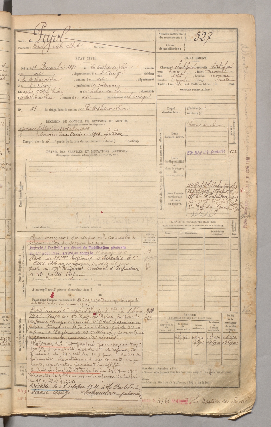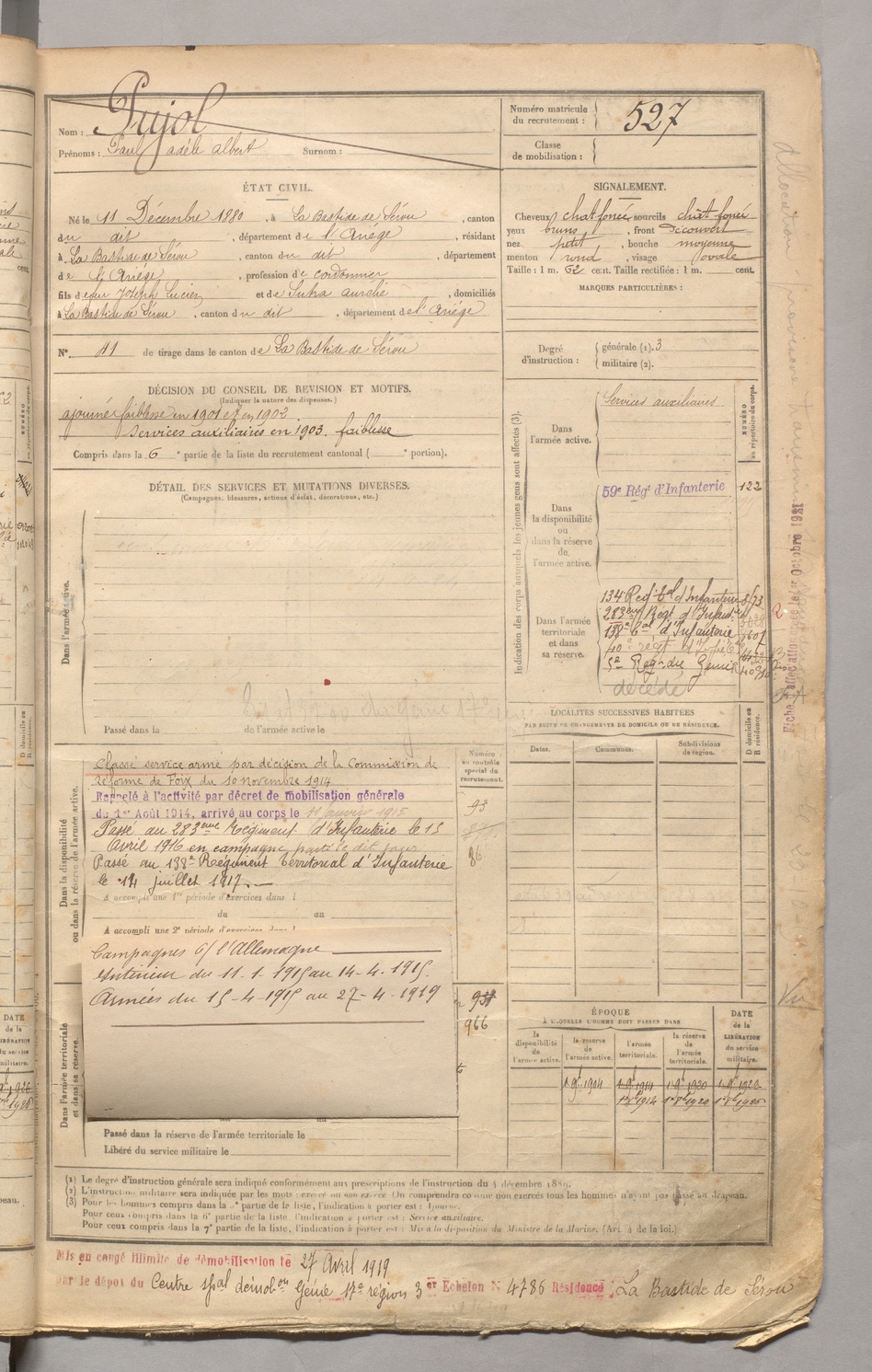 | Pujol | Paul Adèle Albert | FOIX | 129 W 3 | 1900 | Bastide-de-Sérou (La) | Bastide-de-Sérou (La) | 527 |