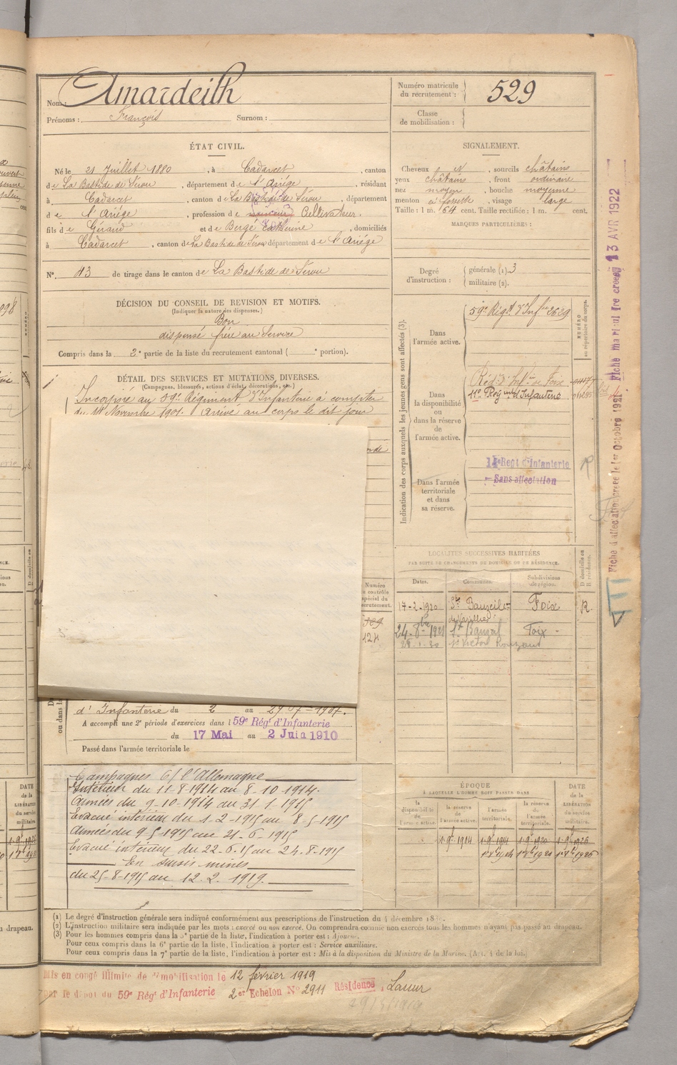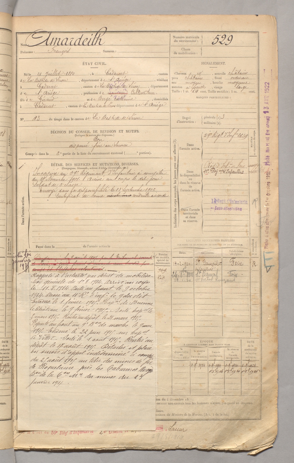 | Amardeilh | François | FOIX | 129 W 3 | 1900 | Cadarcet | Cadarcet | 529 |