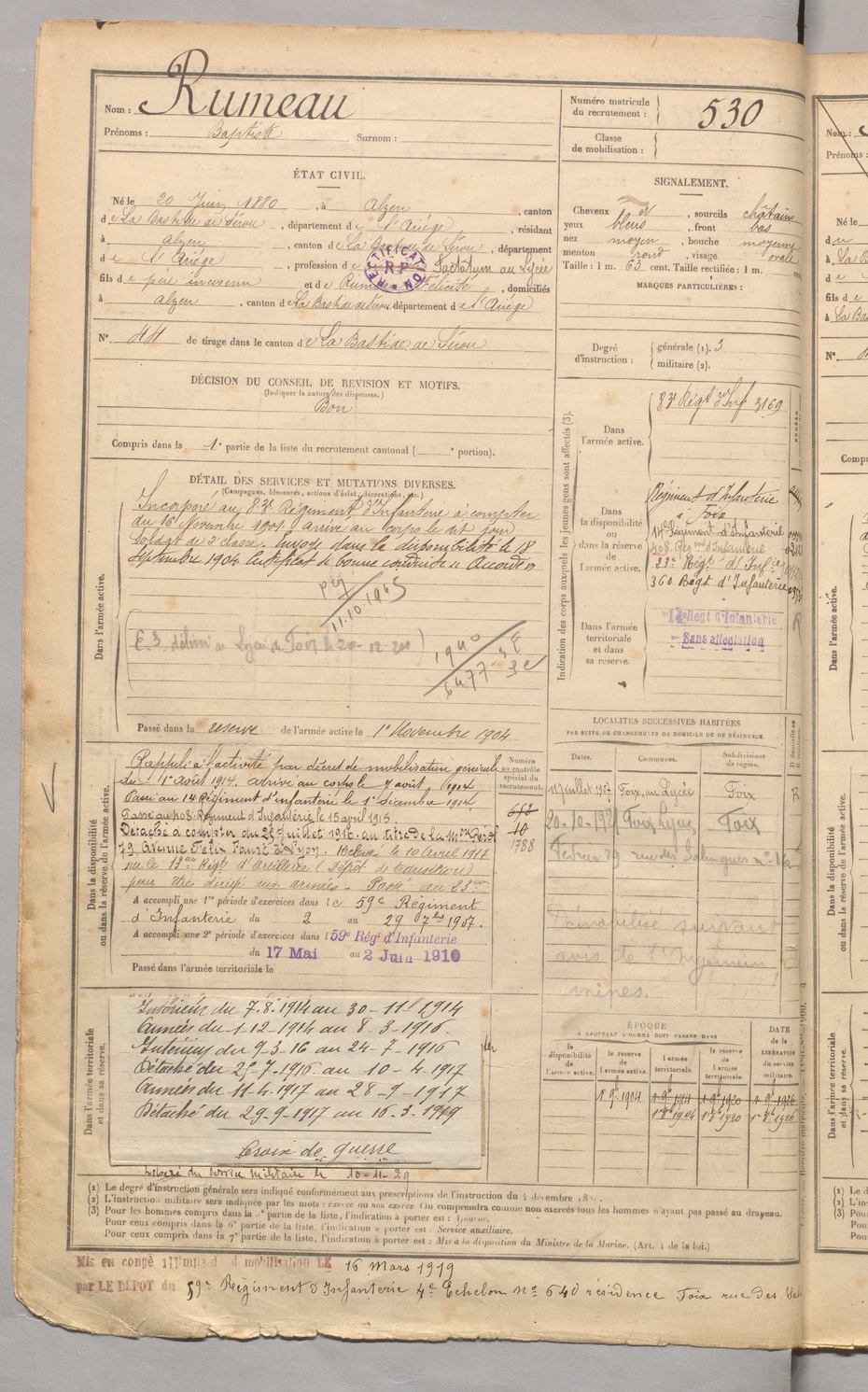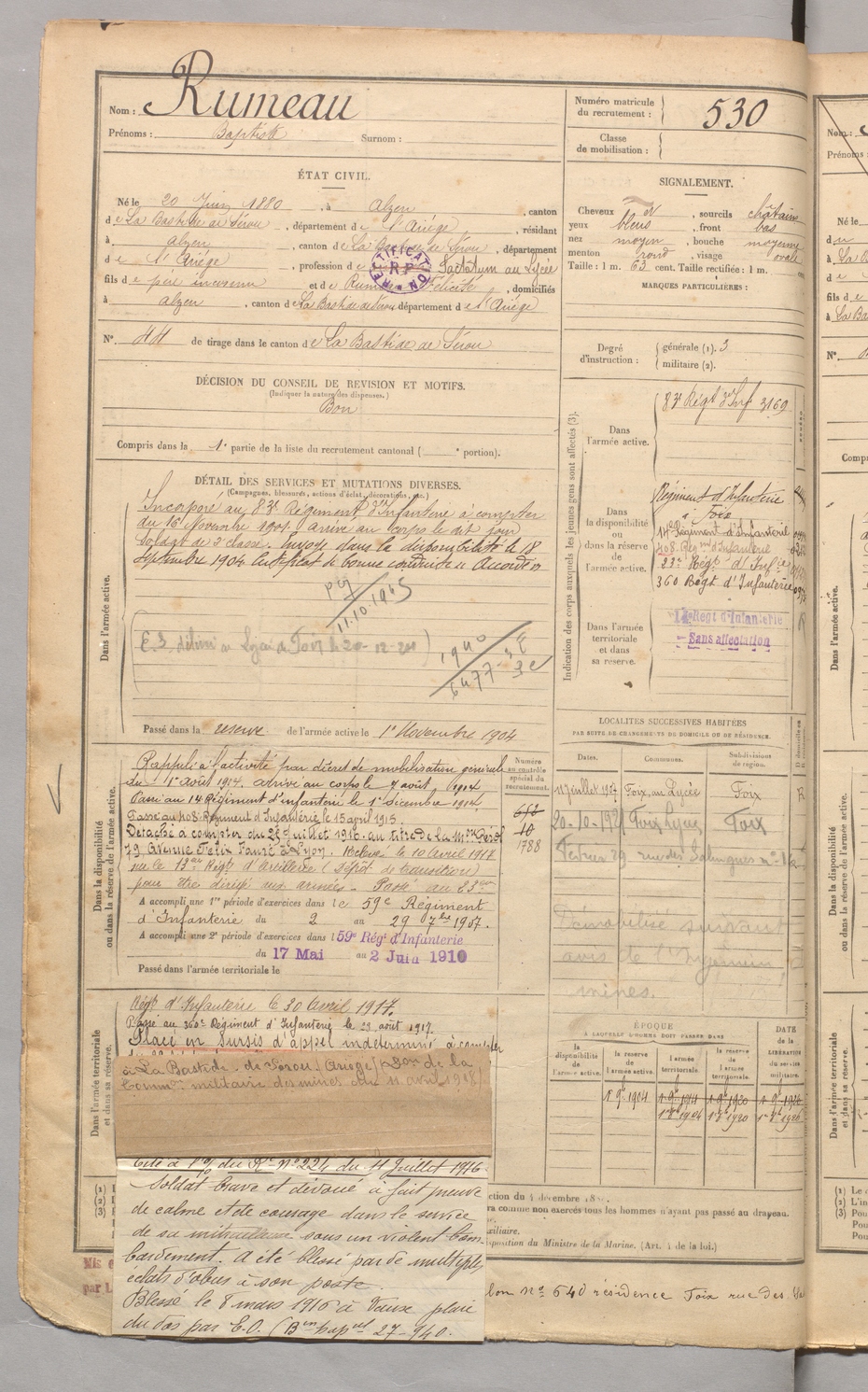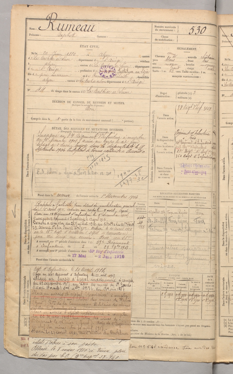 | Rumeau | Baptiste | FOIX | 129 W 3 | 1900 | Alzen | Alzen | 530 |