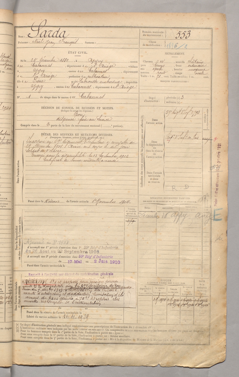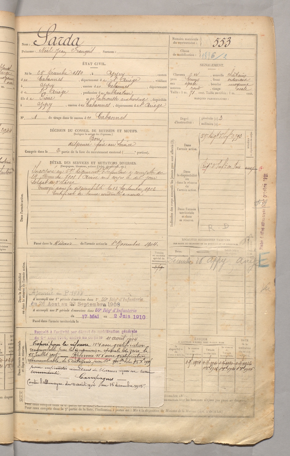 | Sarda | Noël Jean François | FOIX | 129 W 3 | 1900 | Appy | Appy | 553 |