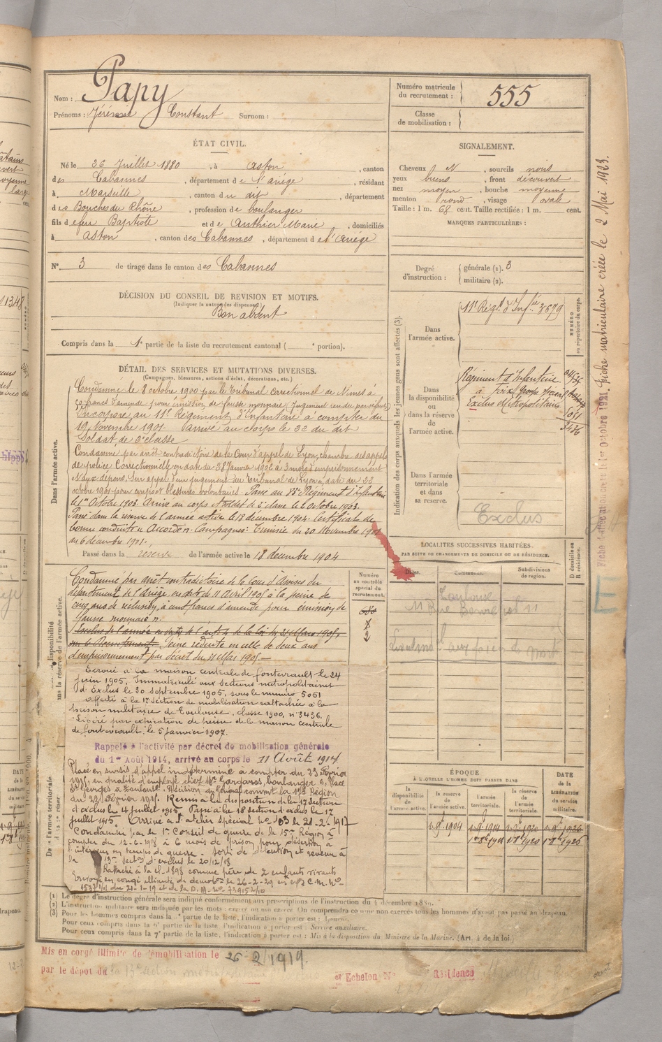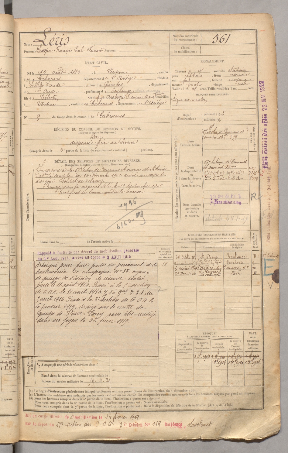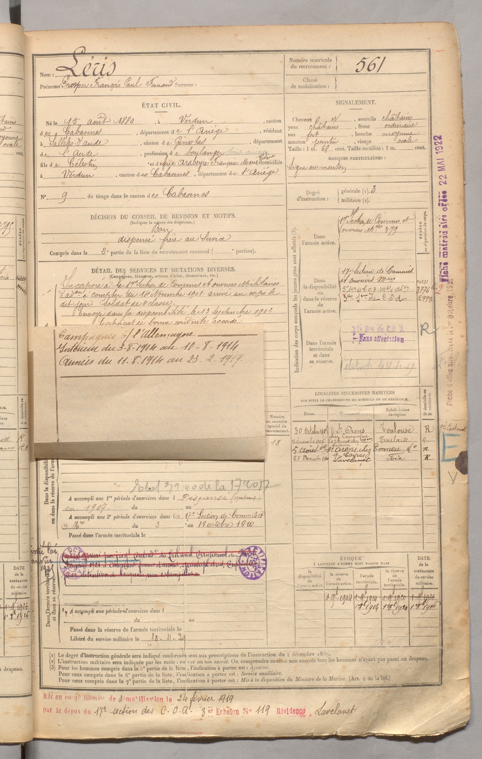 | Léris | Prosper François Paul Fernand | FOIX | 129 W 3 | 1900 | Verdun | Sallèles-D'Aude | 561 |