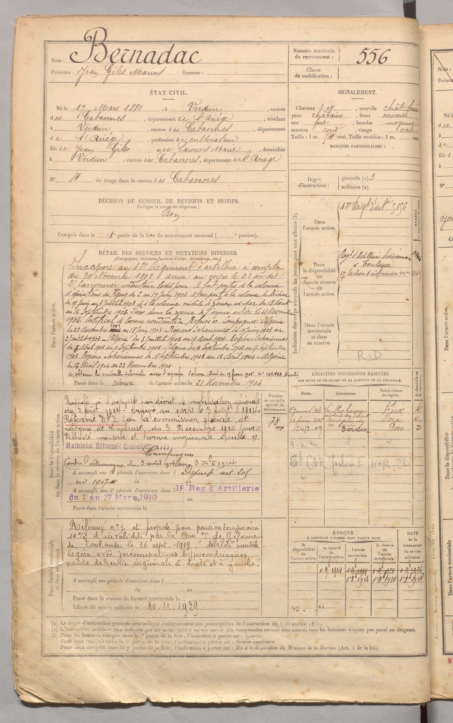 | Bernadac | Jean Giles Marius | FOIX | 129 W 3 | 1900 | Verdun | Verdun | 556 |