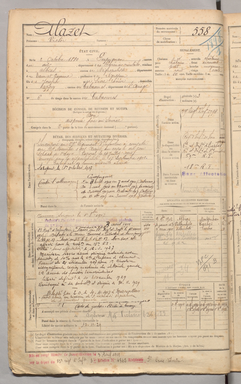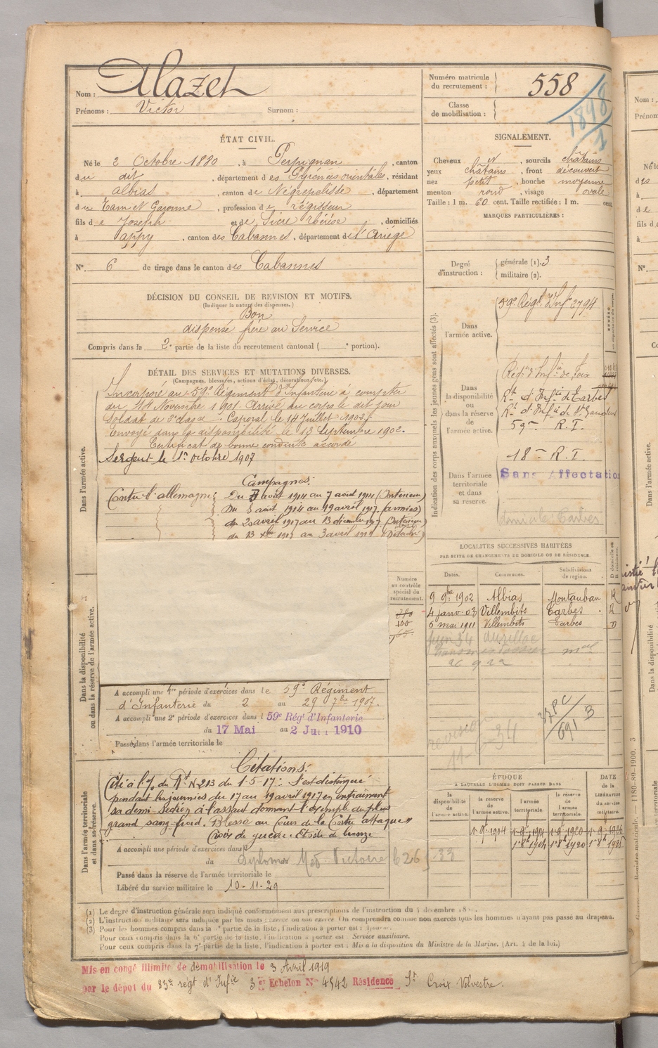 | Alazet | Victor | FOIX | 129 W 3 | 1900 | Perpignan | Albias | 558 |
