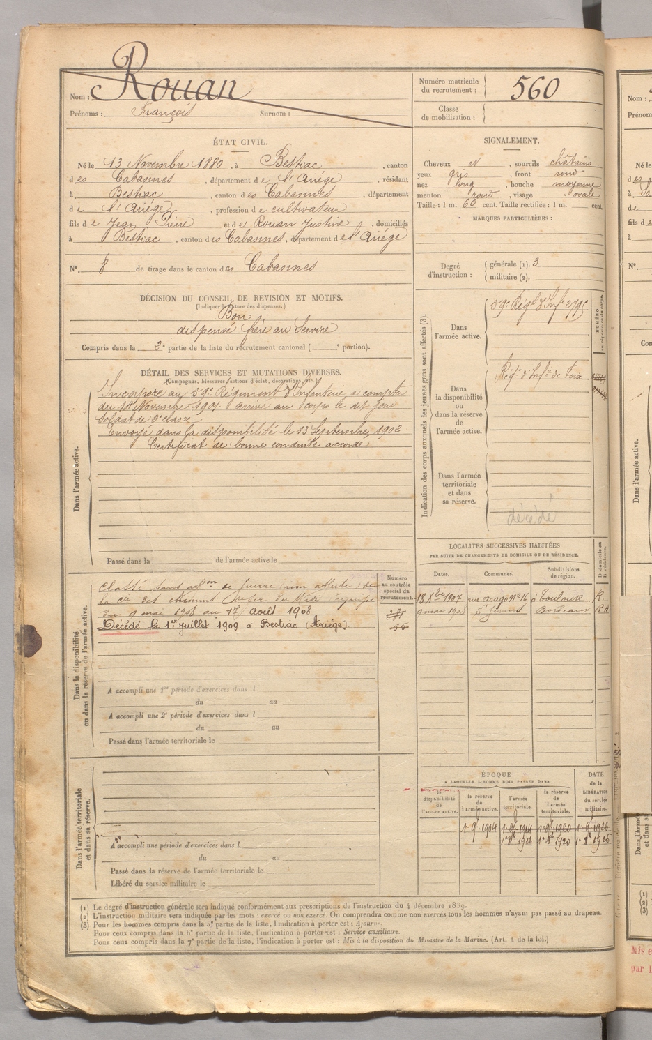 | Rouan | François | FOIX | 129 W 3 | 1900 | Bestiac | Bestiac | 560 |
