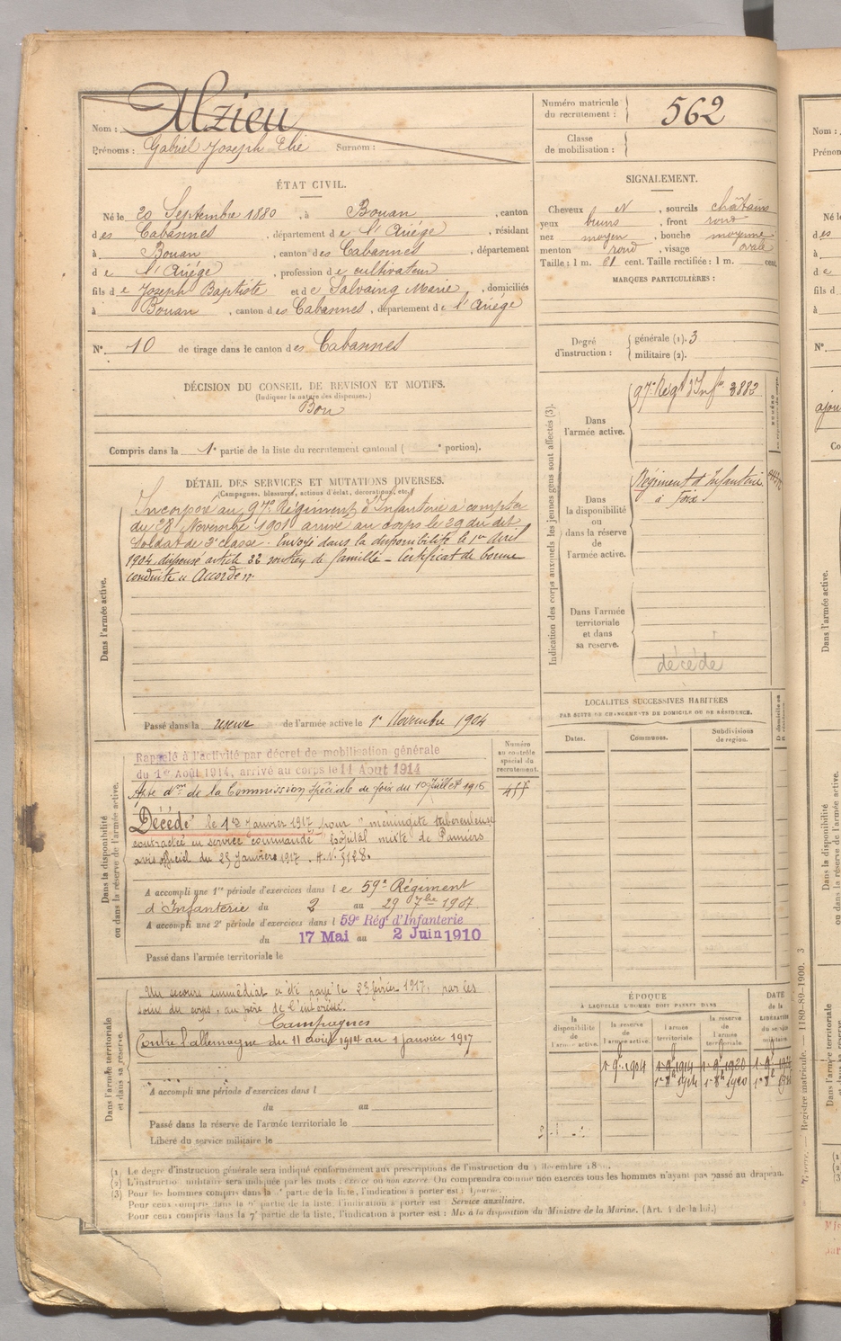 | Alzieu | Gabriel Joseph Elie | FOIX | 129 W 3 | 1900 | Bouan | Bouan | 562 |