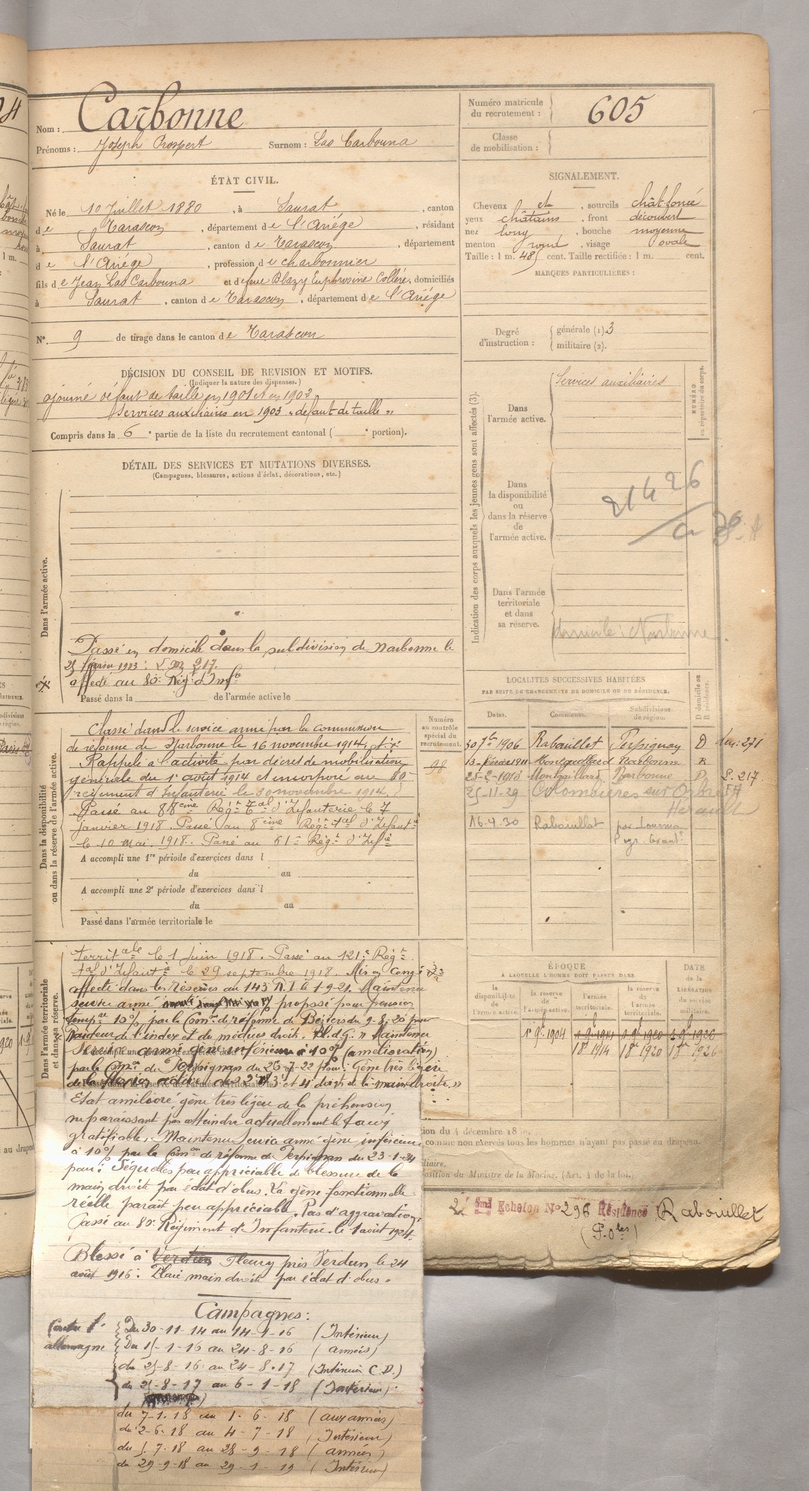 | Carbonne | Joseph Prospert dit Las Carbouna | FOIX | 129 W 3 | 1900 | Saurat | Saurat | 605 |