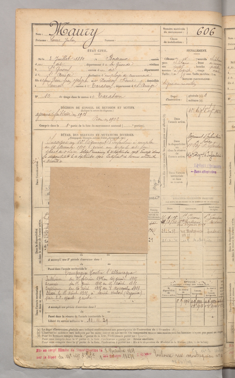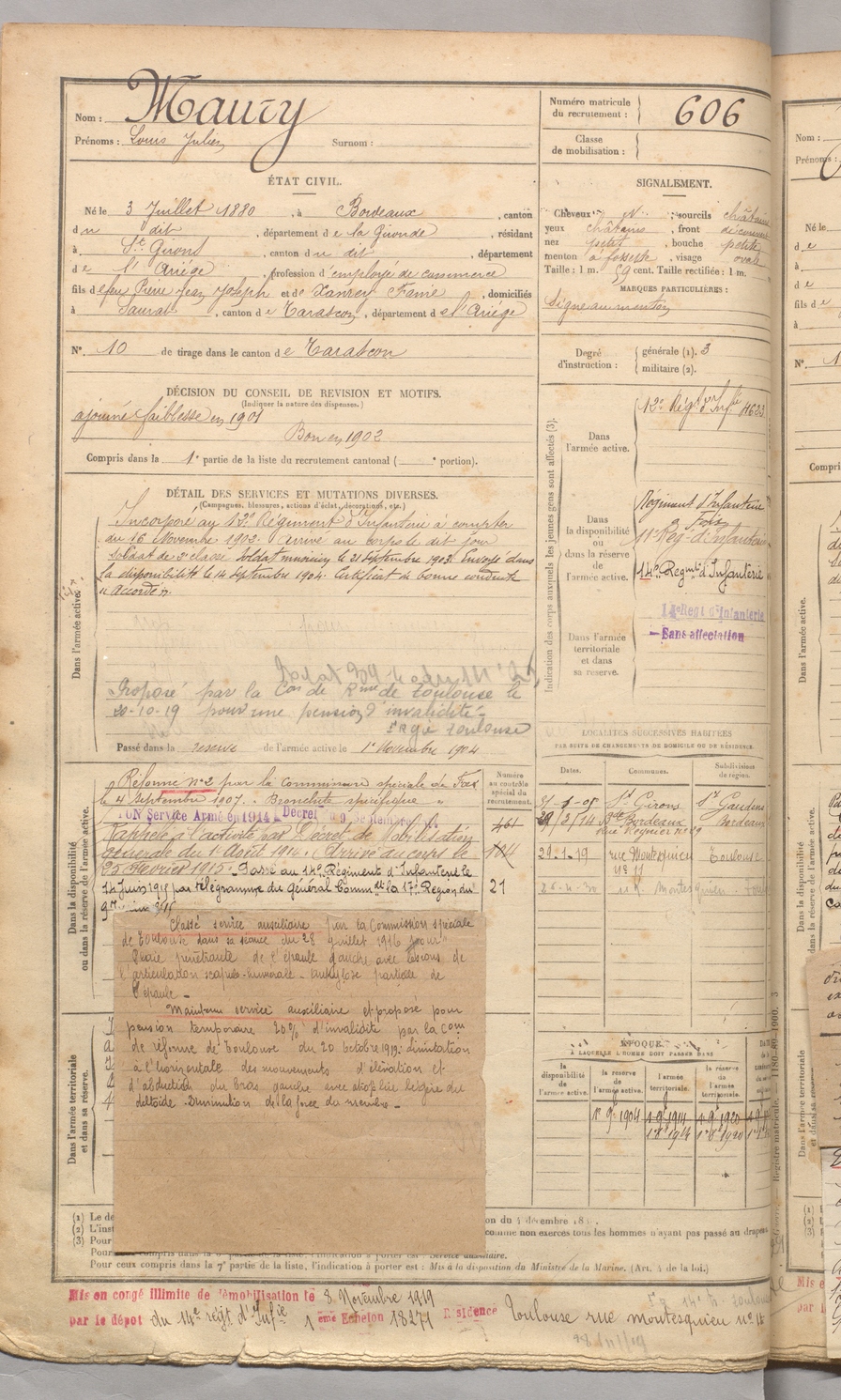| Maury | Louis Julien | FOIX | 129 W 3 | 1900 | Bordeaux | Saint-Girons | 606 |