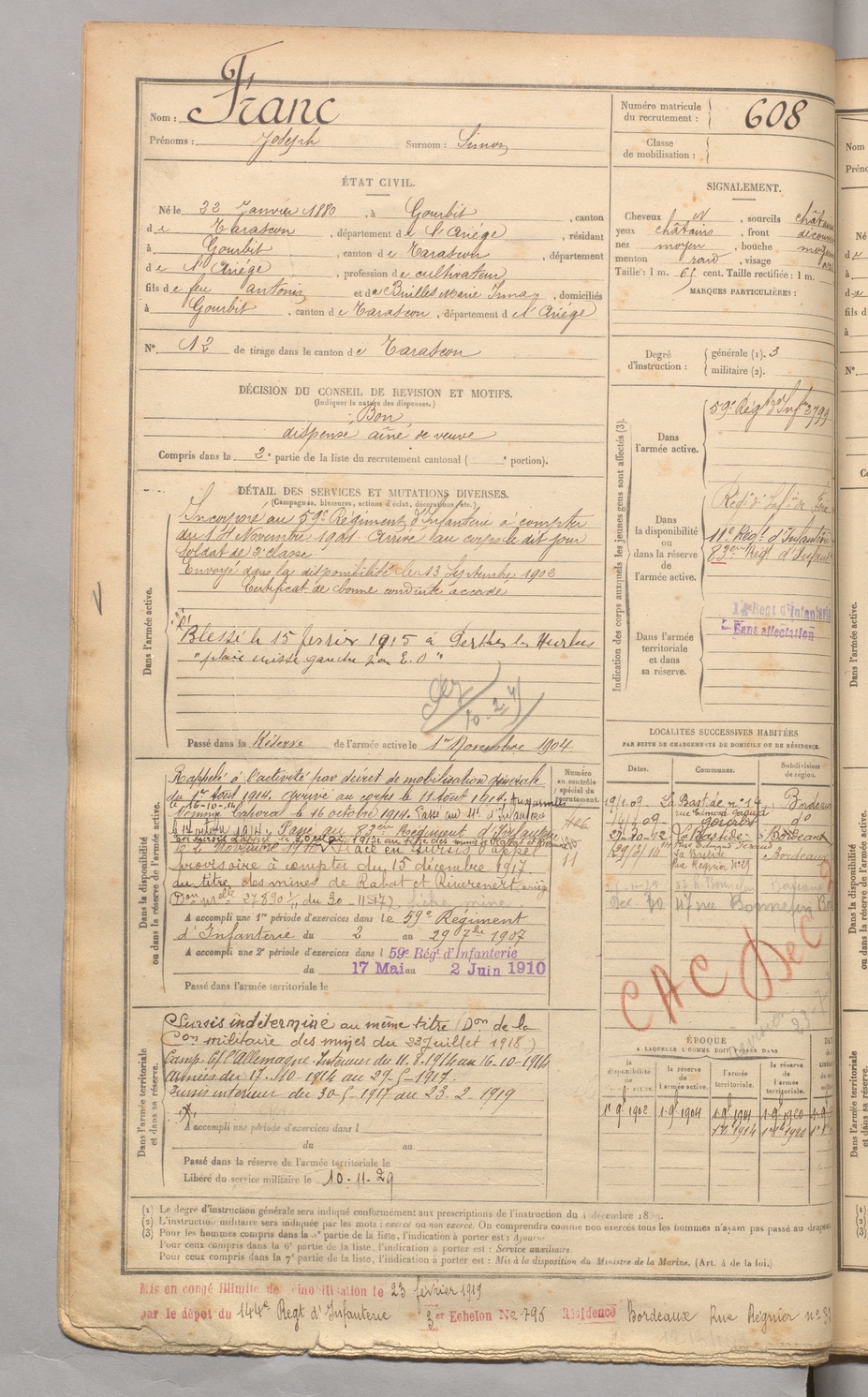 | Franc | Joseph dit Simon | FOIX | 129 W 3 | 1900 | Gourbit | Gourbit | 608 |