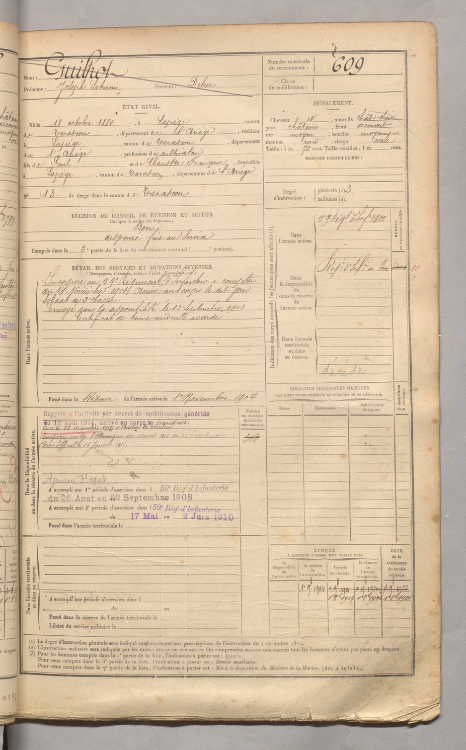 | Guilhot | Joseph Saturnin dit Delrec | FOIX | 129 W 3 | 1900 | Lapège | Lapège | 609 |
