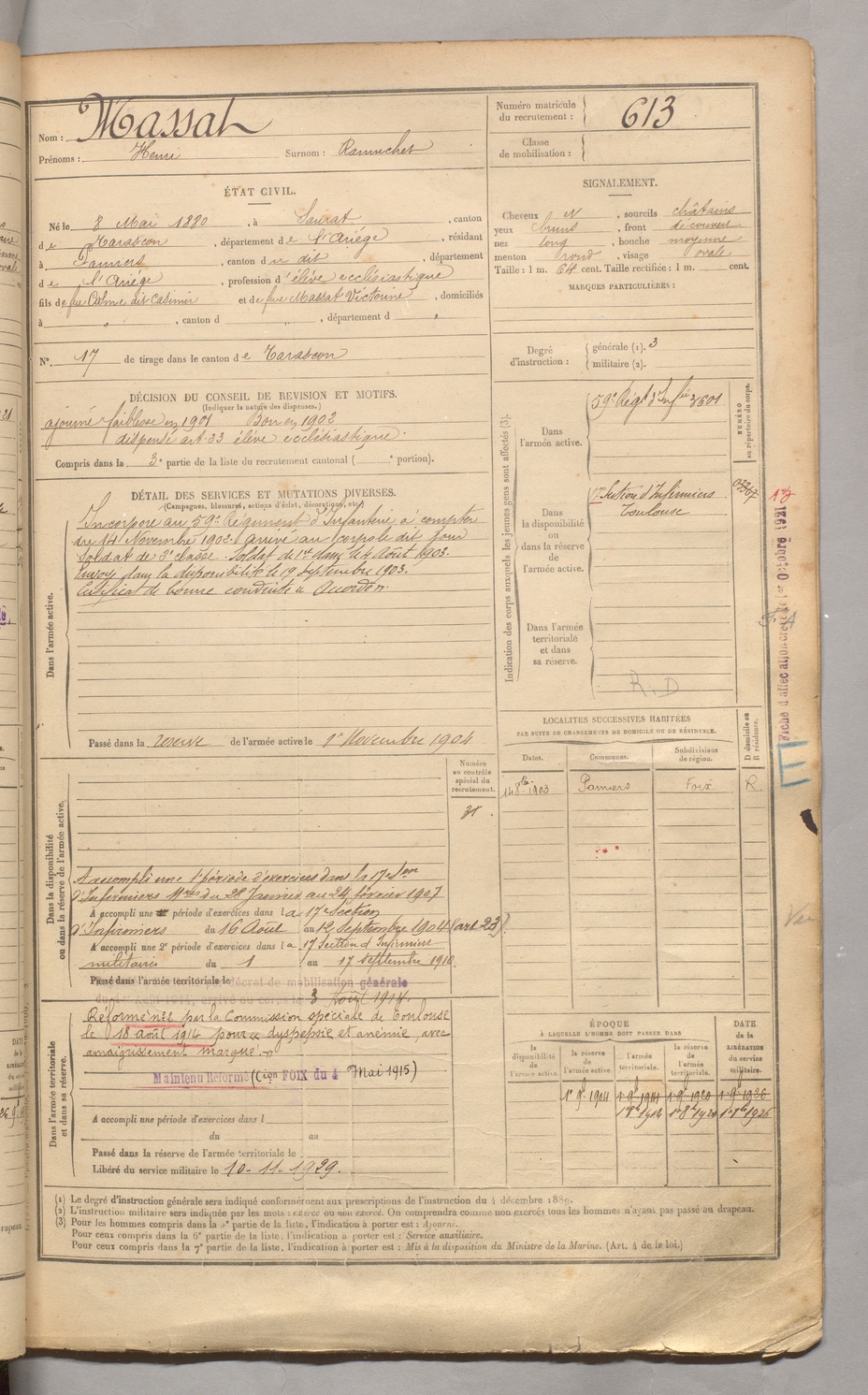 | Massat | Henri dit Ramuchet | FOIX | 129 W 3 | 1900 | Saurat | Pamiers | 613 |