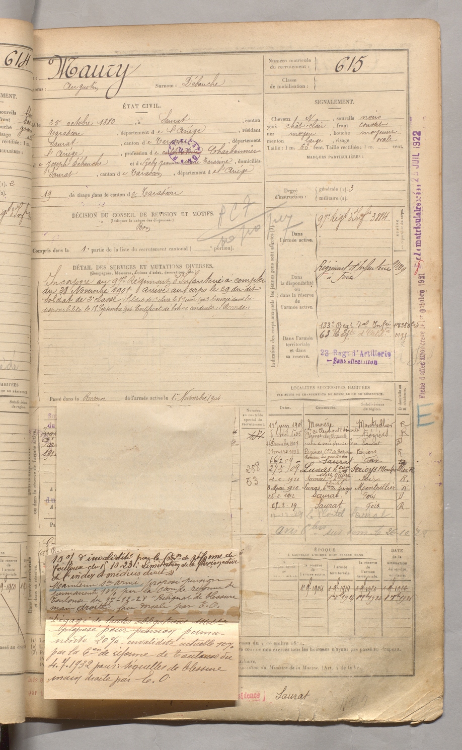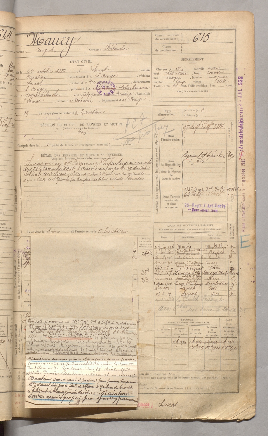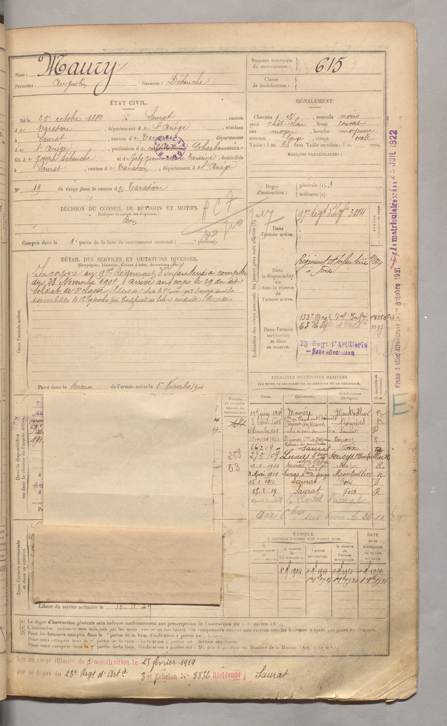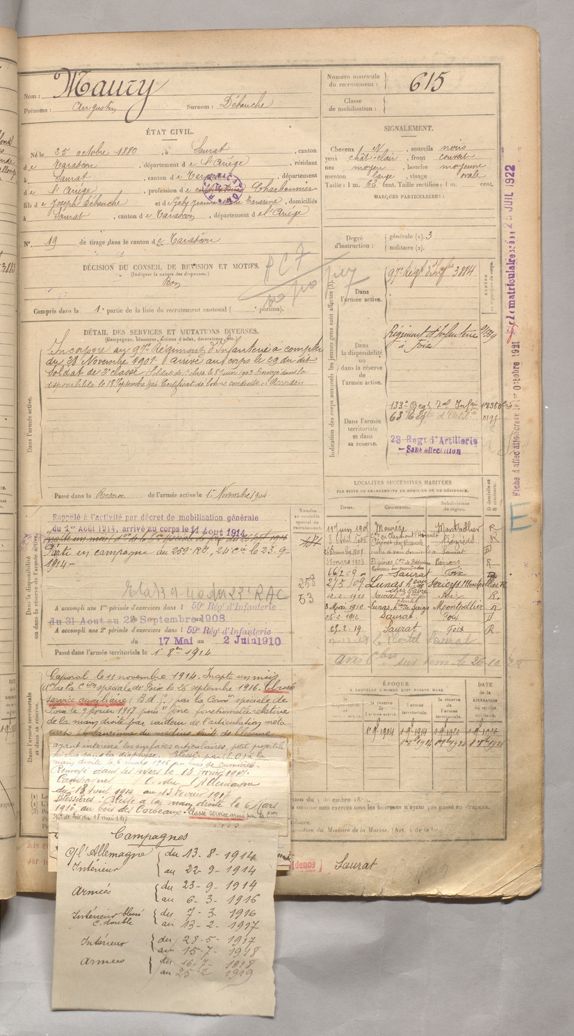 | Maury | Augustin dit Débouche | FOIX | 129 W 3 | 1900 | Saurat | Saurat | 615 |