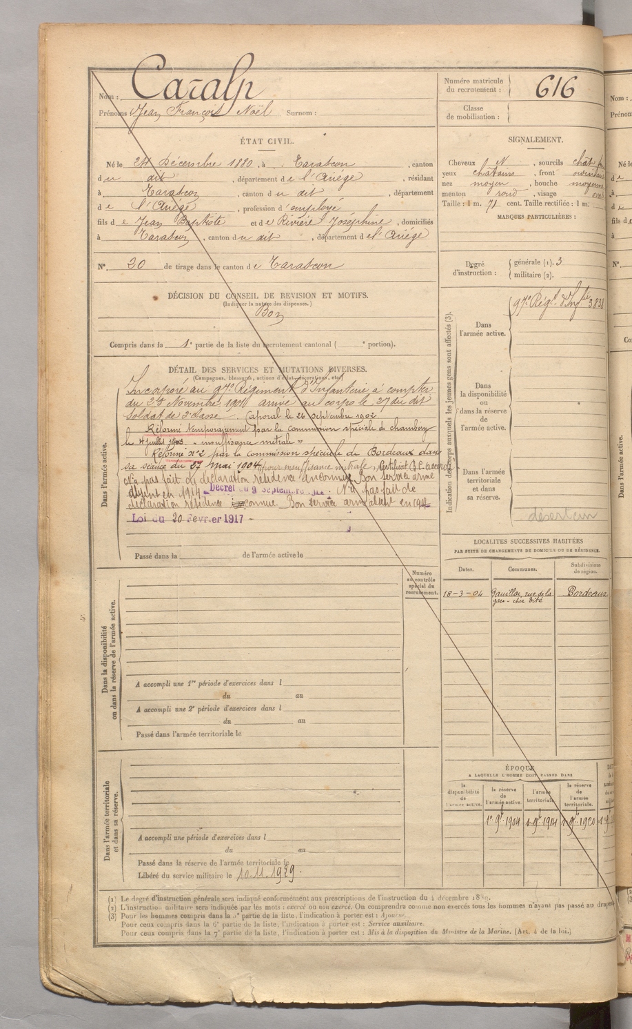 | Caralp | Jean François Noël | FOIX | 129 W 3 | 1900 | Tarascon | Tarascon | 616 |