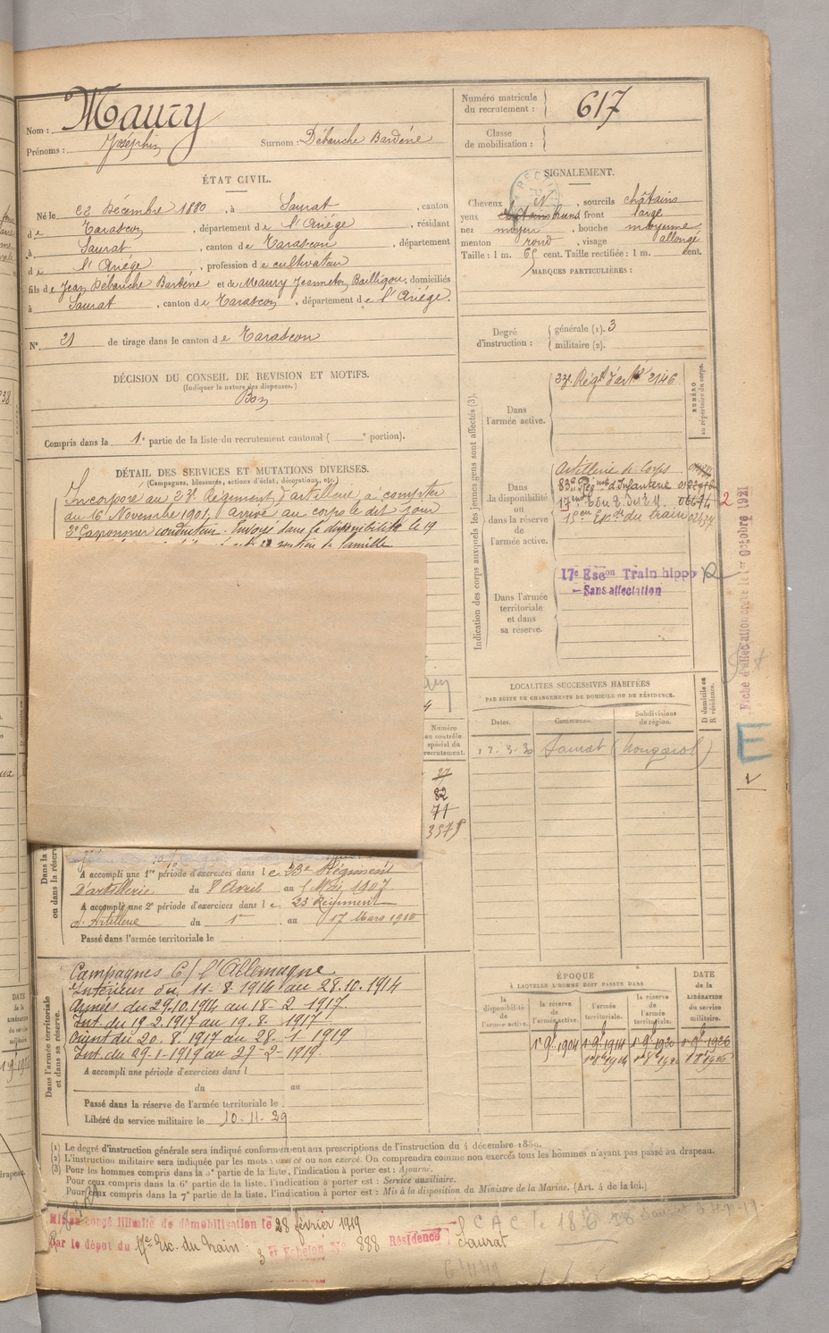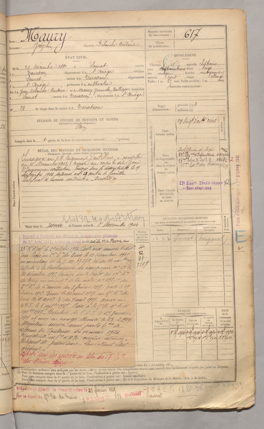| Maury | Joséphin dit Débouche Bardène | FOIX | 129 W 3 | 1900 | Saurat | Saurat | 617 |