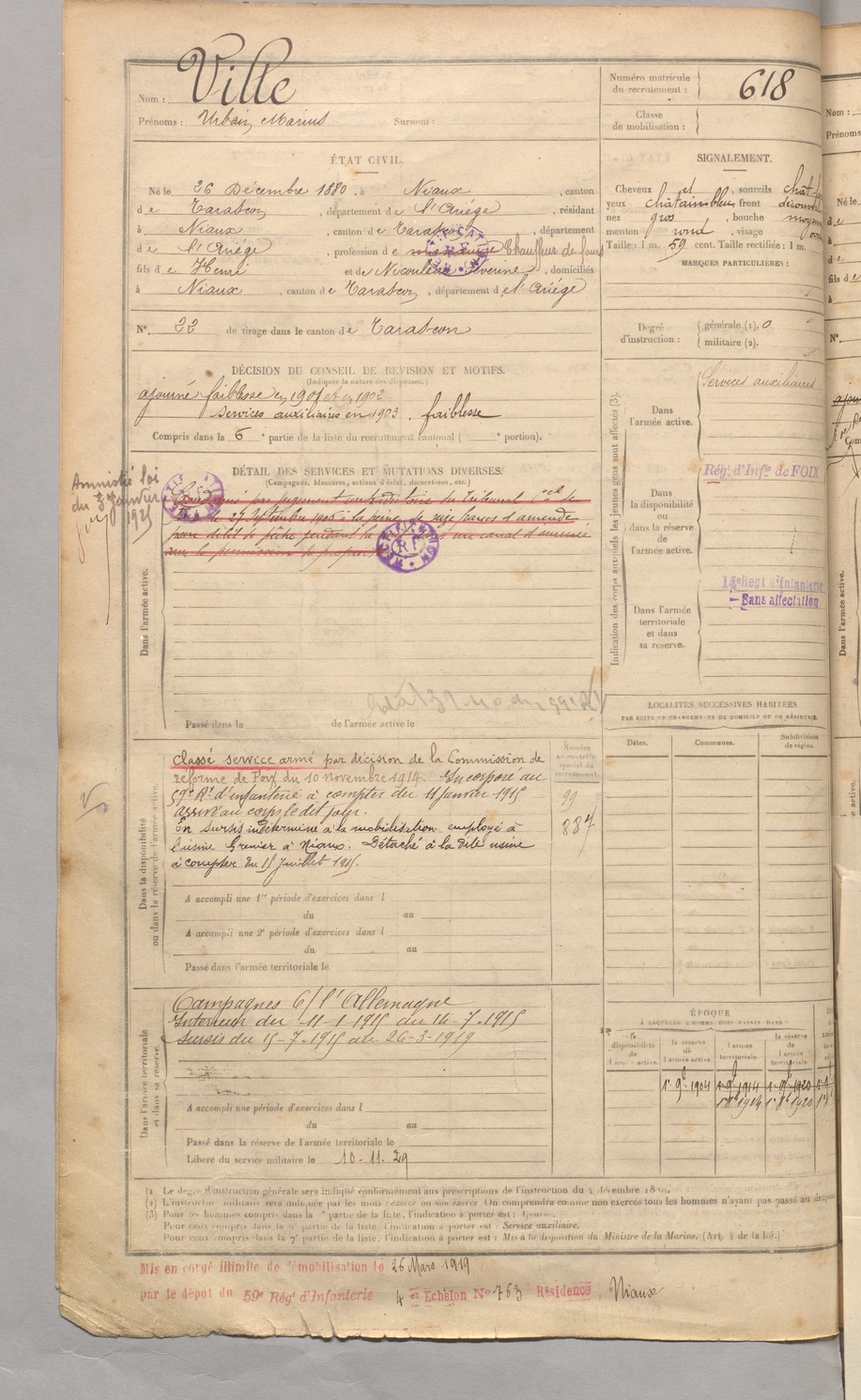 | Ville | Urbain Marius | FOIX | 129 W 3 | 1900 | Niaux | Niaux | 618 |
