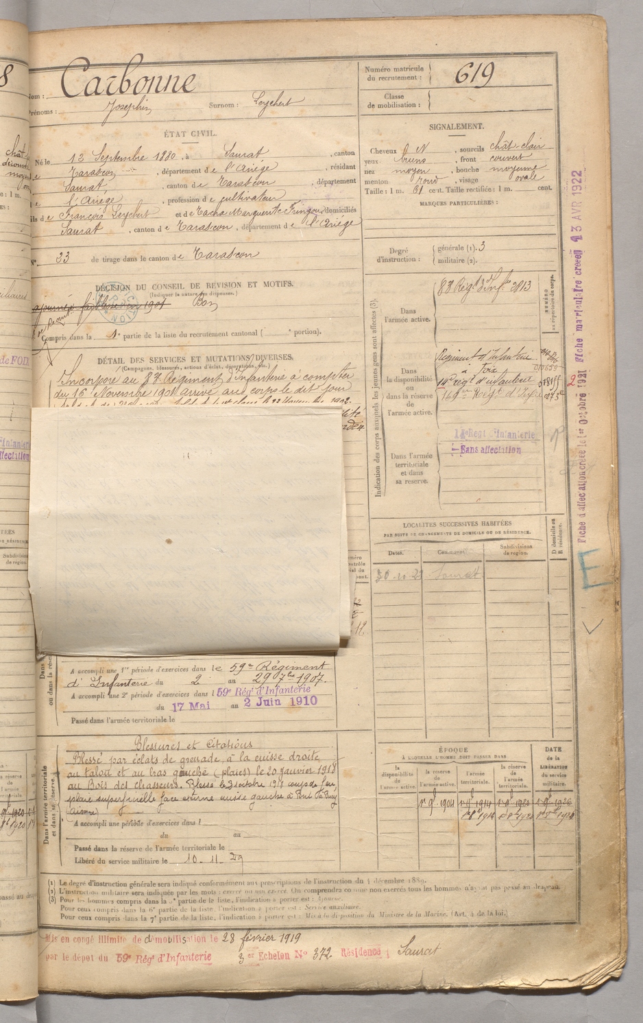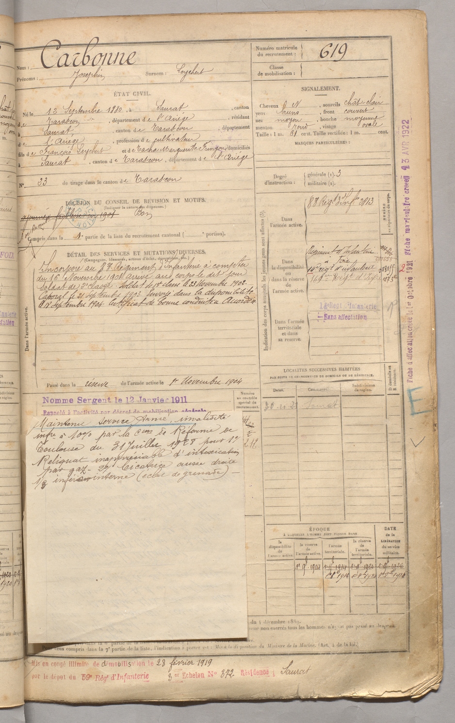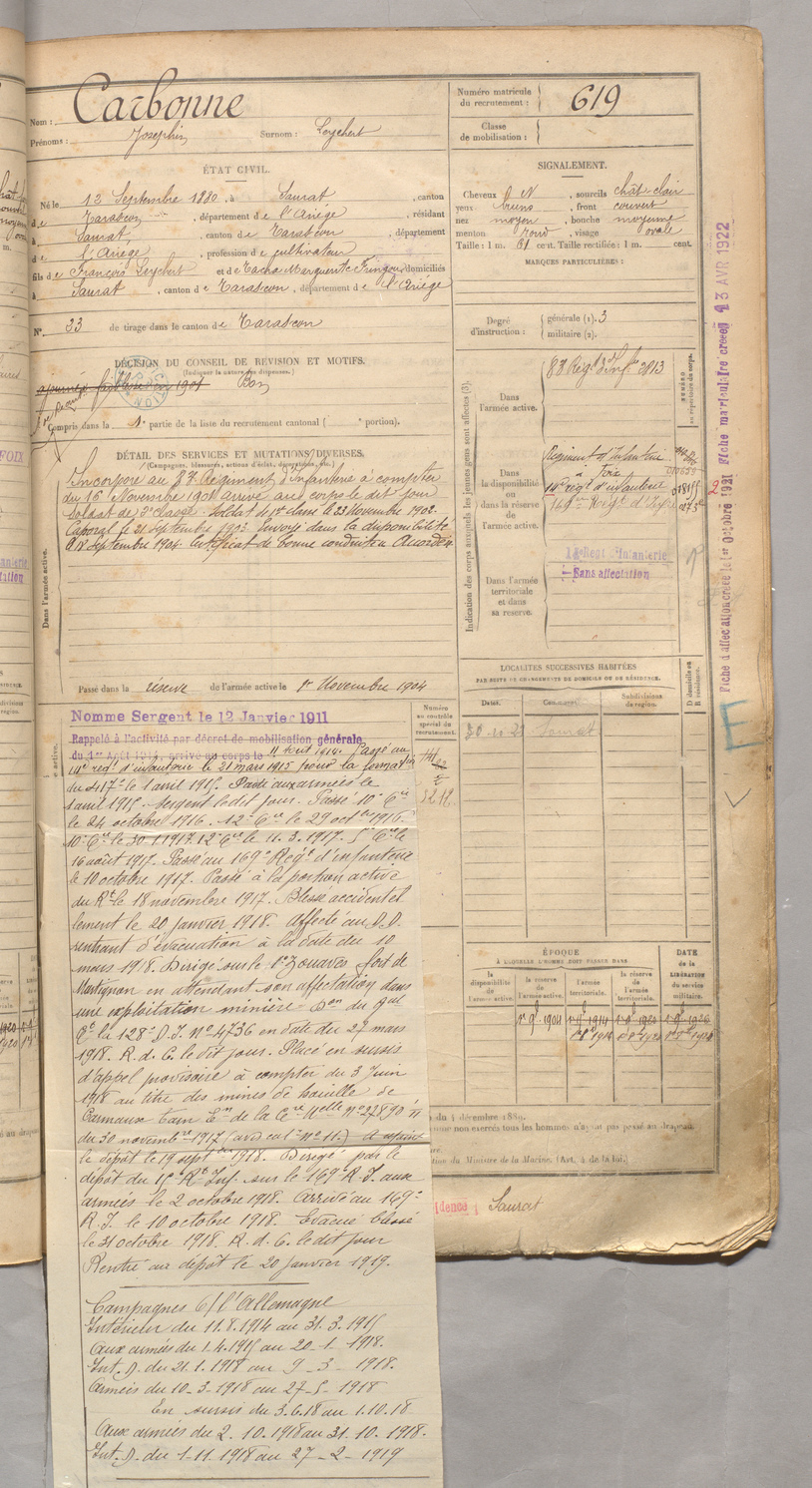 | Carbonne | Josephin dit Leychert | FOIX | 129 W 3 | 1900 | Saurat | Saurat | 619 |