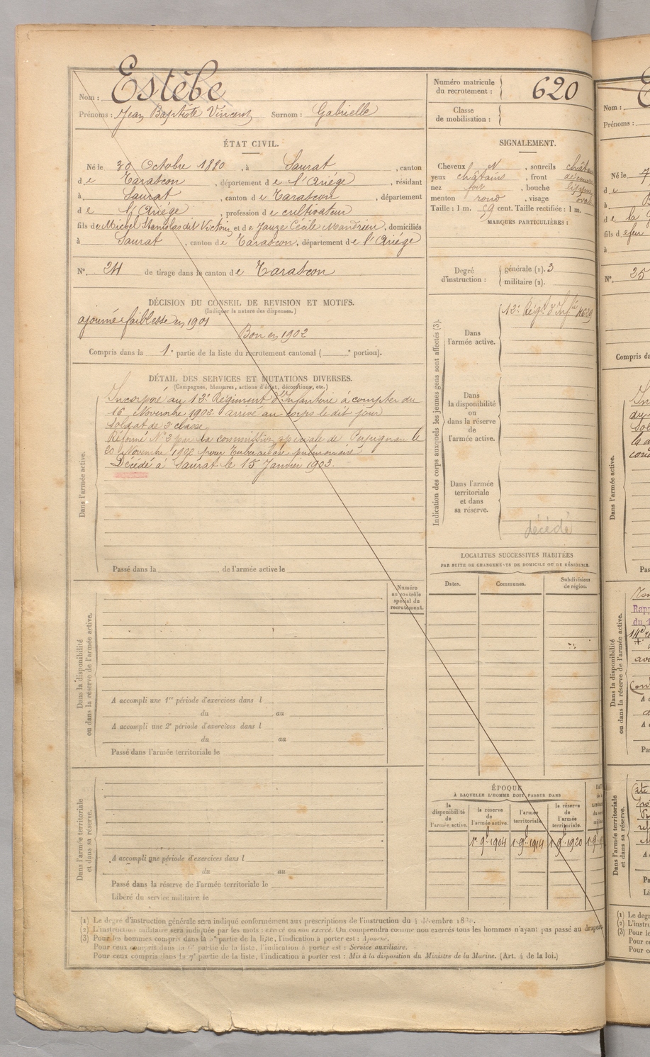 | Estèbe | Jean Baptiste Vincent dit Gabrielle | FOIX | 129 W 3 | 1900 | Saurat | Saurat | 620 |
