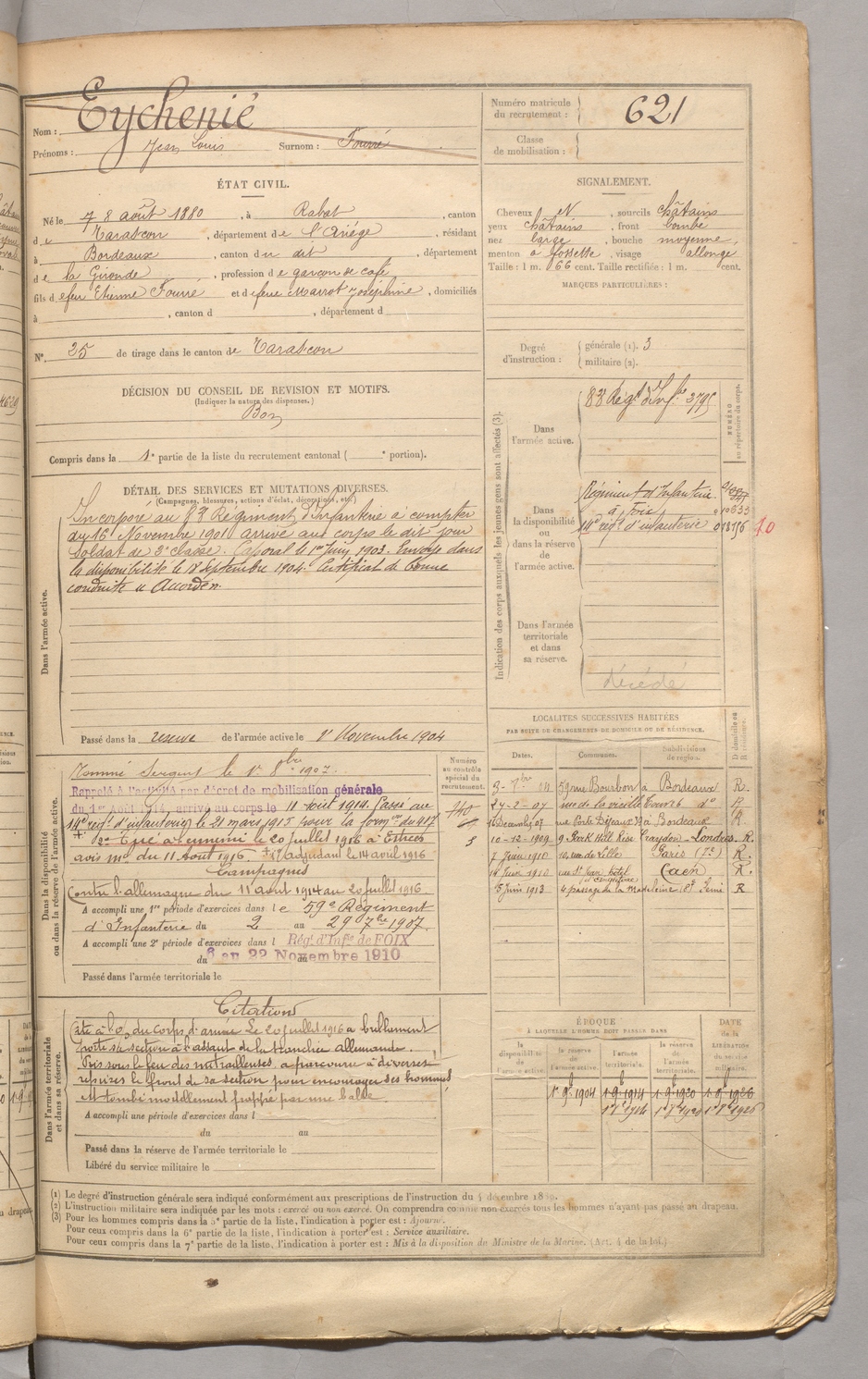 | Eychenié | Jean Louis dit Fourré | FOIX | 129 W 3 | 1900 | Rabat-les-Trois-Seigneurs | Bordeaux | 621 |