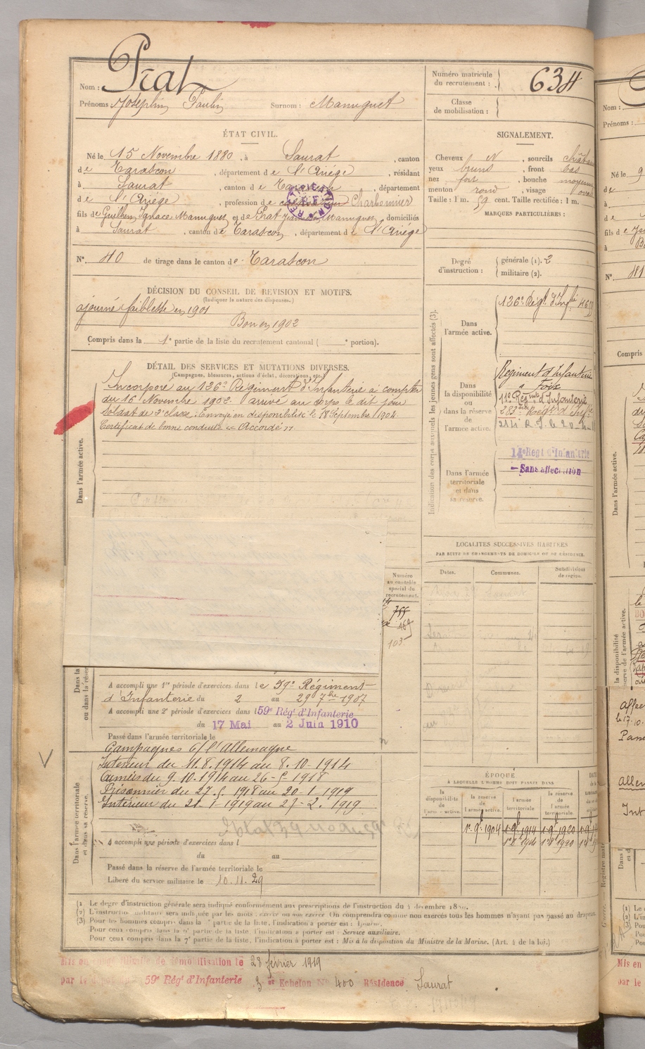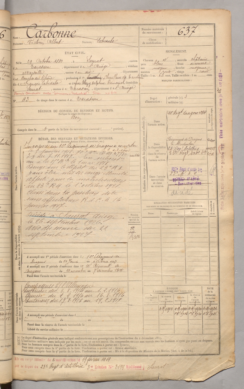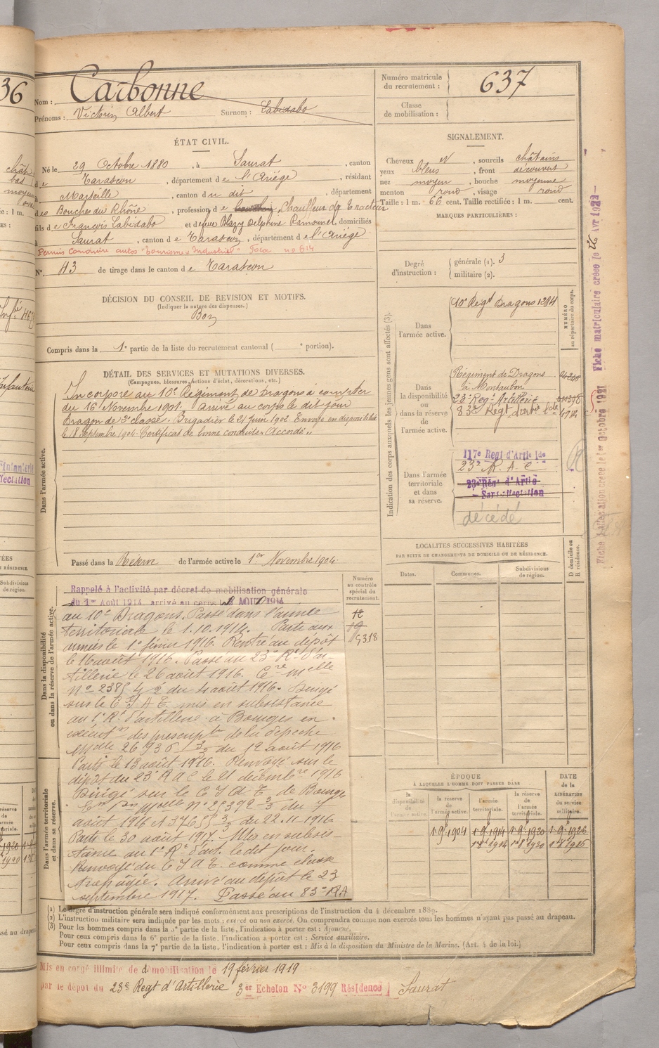 | Carbonne | Victorin Albert dit Labidabo | FOIX | 129 W 3 | 1900 | Saurat | Marseille | 637 |