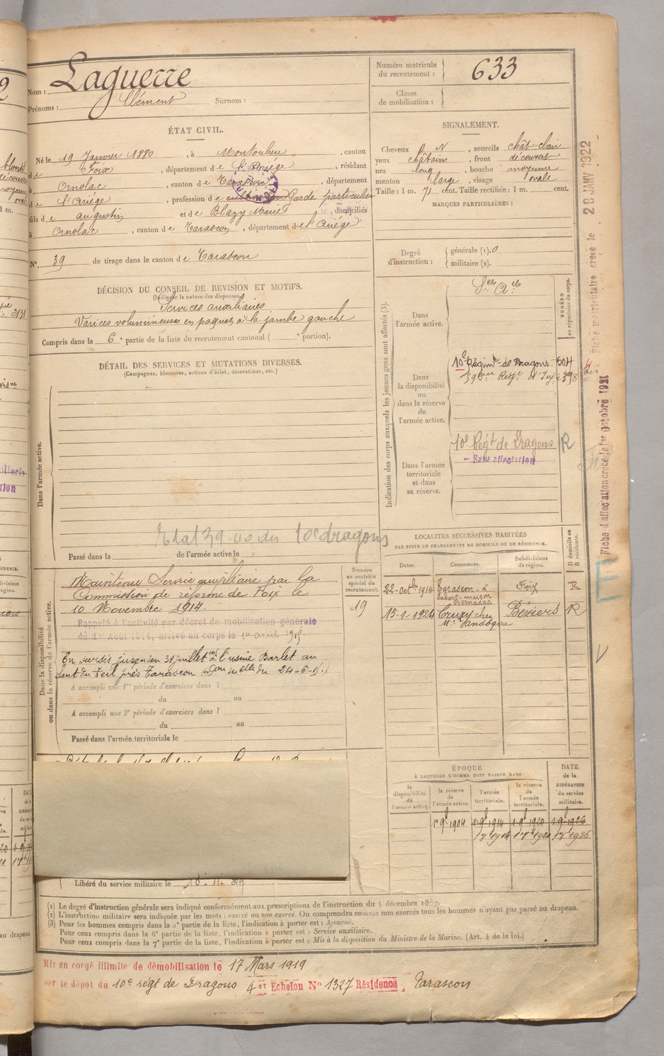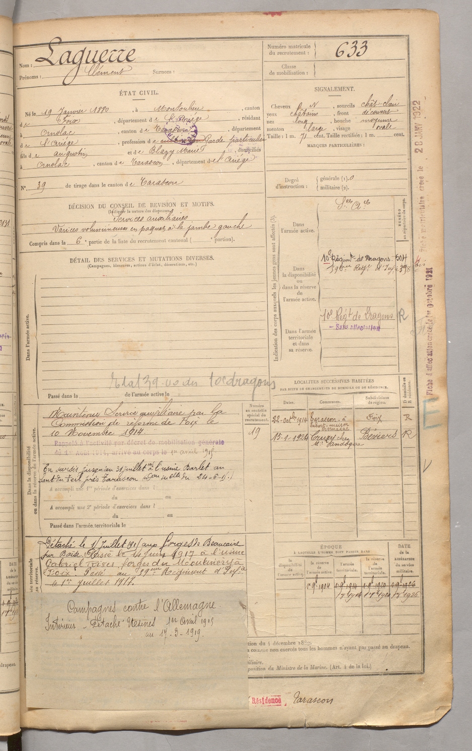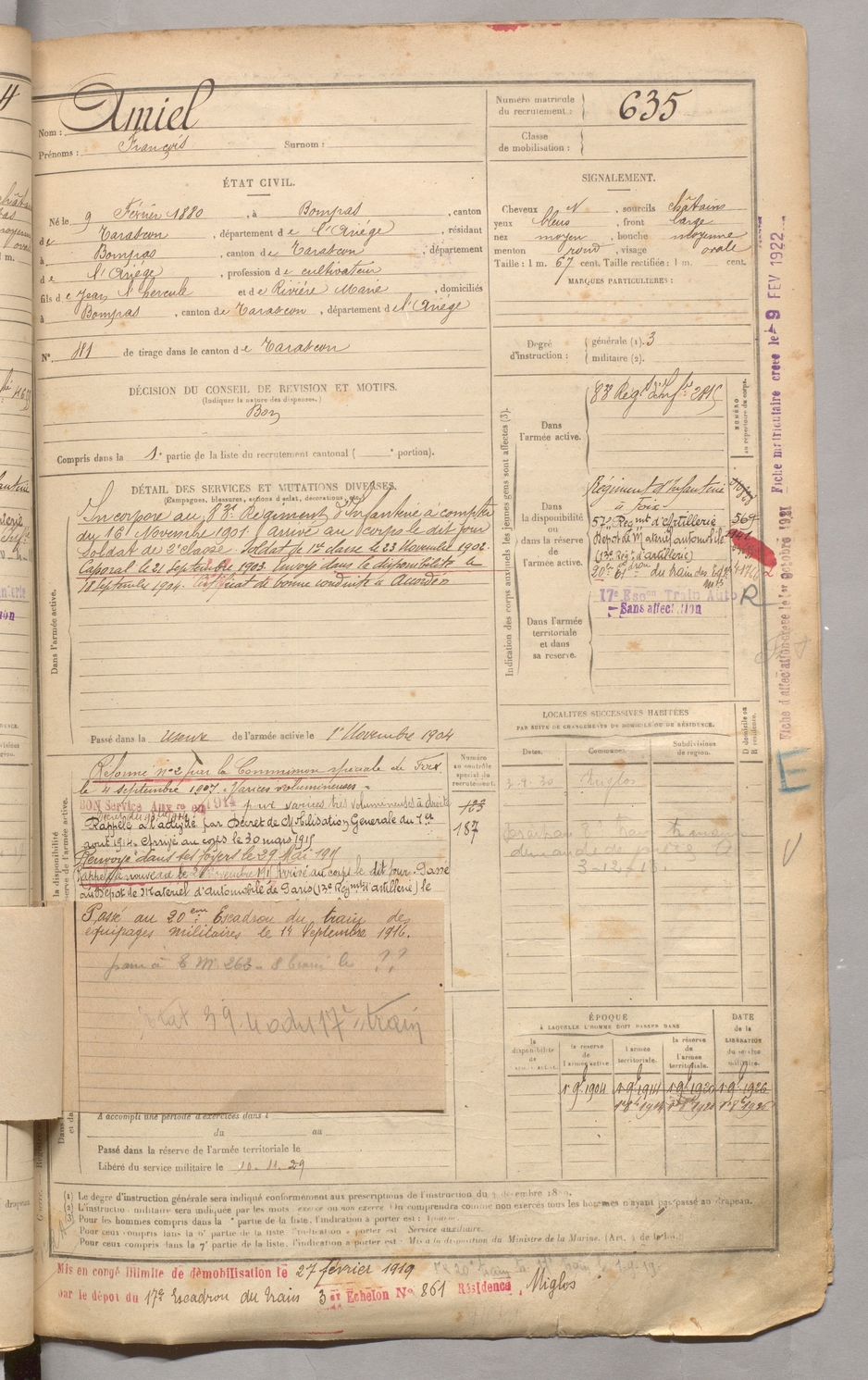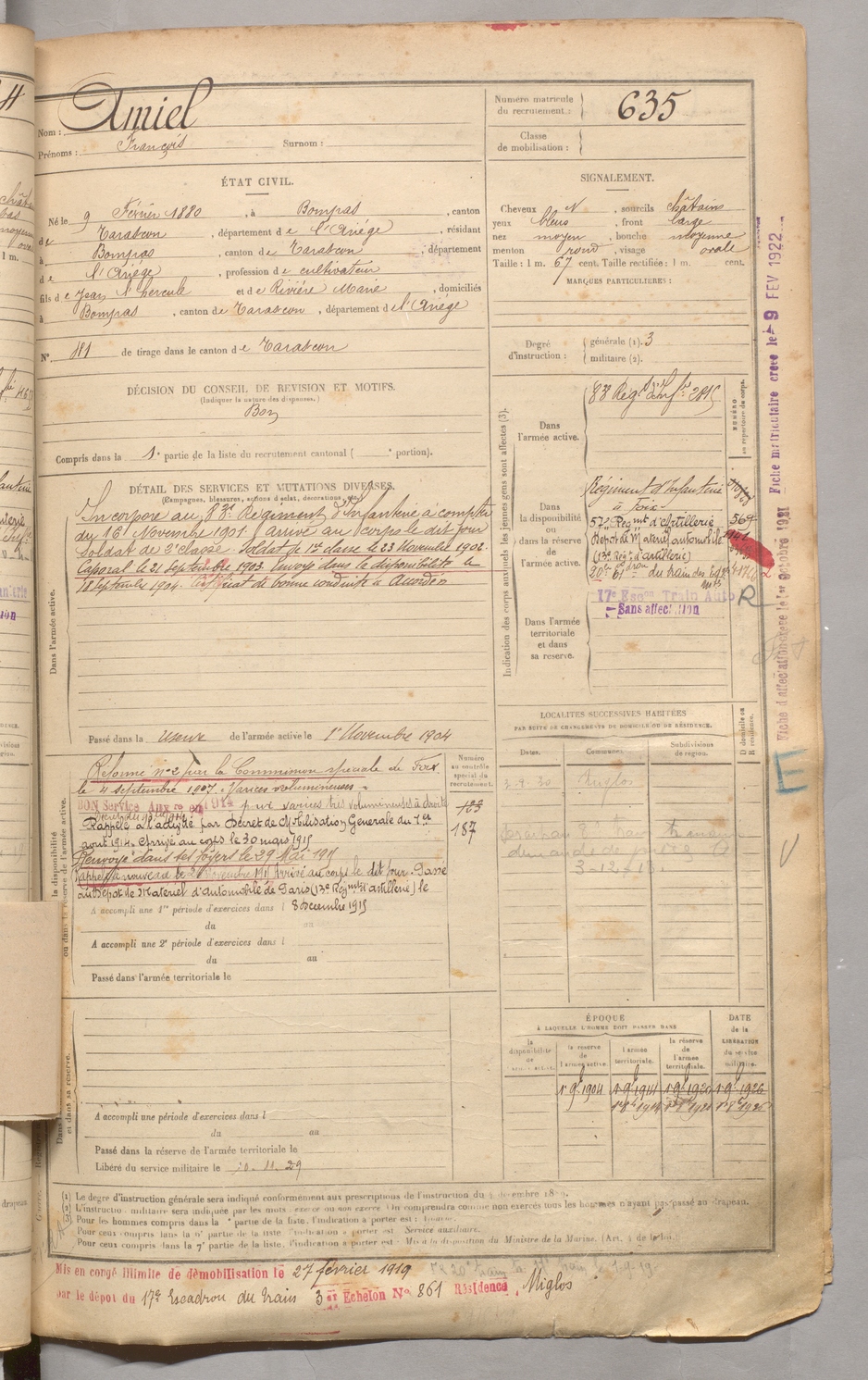 | Carbonne | Victorin Albert dit Labidabo | FOIX | 129 W 3 | 1900 | Saurat | Marseille | 637 |